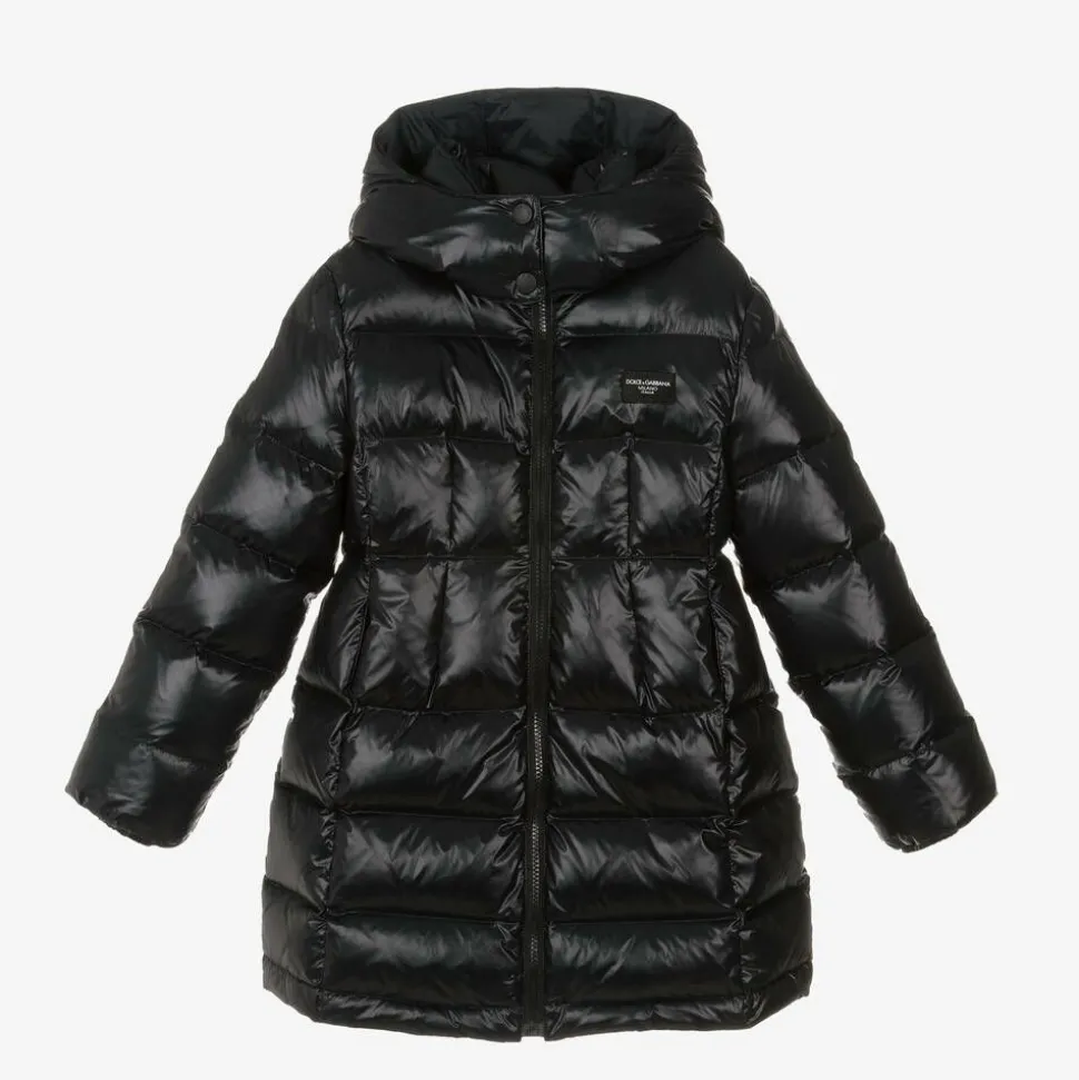 Black puffer coat for girls by luxury label Dolce & Gabbana, with a practical, detachable hood. Lovely for those cooler months, this warmly padded coat is made in a silky fabric with a gorgeous sheen. It has useful pockets on the front and for that signature look, the Italian brand's logo patch can be seen on the chest. Elasticated cuffs, a high collar and a smooth zip fastening complete the stylish look.