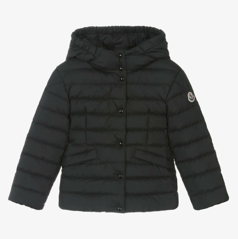 A stylish black Mini-me puffer jacket for girls by luxury brand Moncler Enfant, made in recycled matt fabric with a soft feel. Padded with down, this lightweight outerwear piece has a water repellent outer and a zip fastening on the front. This is concealed by branded black poppers. The exterior pockets secure with poppers and the close-fitting cuffs are gently elasticated for added comfort. Providing extra warmth on a cold day, the elasticated hood helps to lock in heat. The designer's felted logo adds signature detailing to one sleeve.