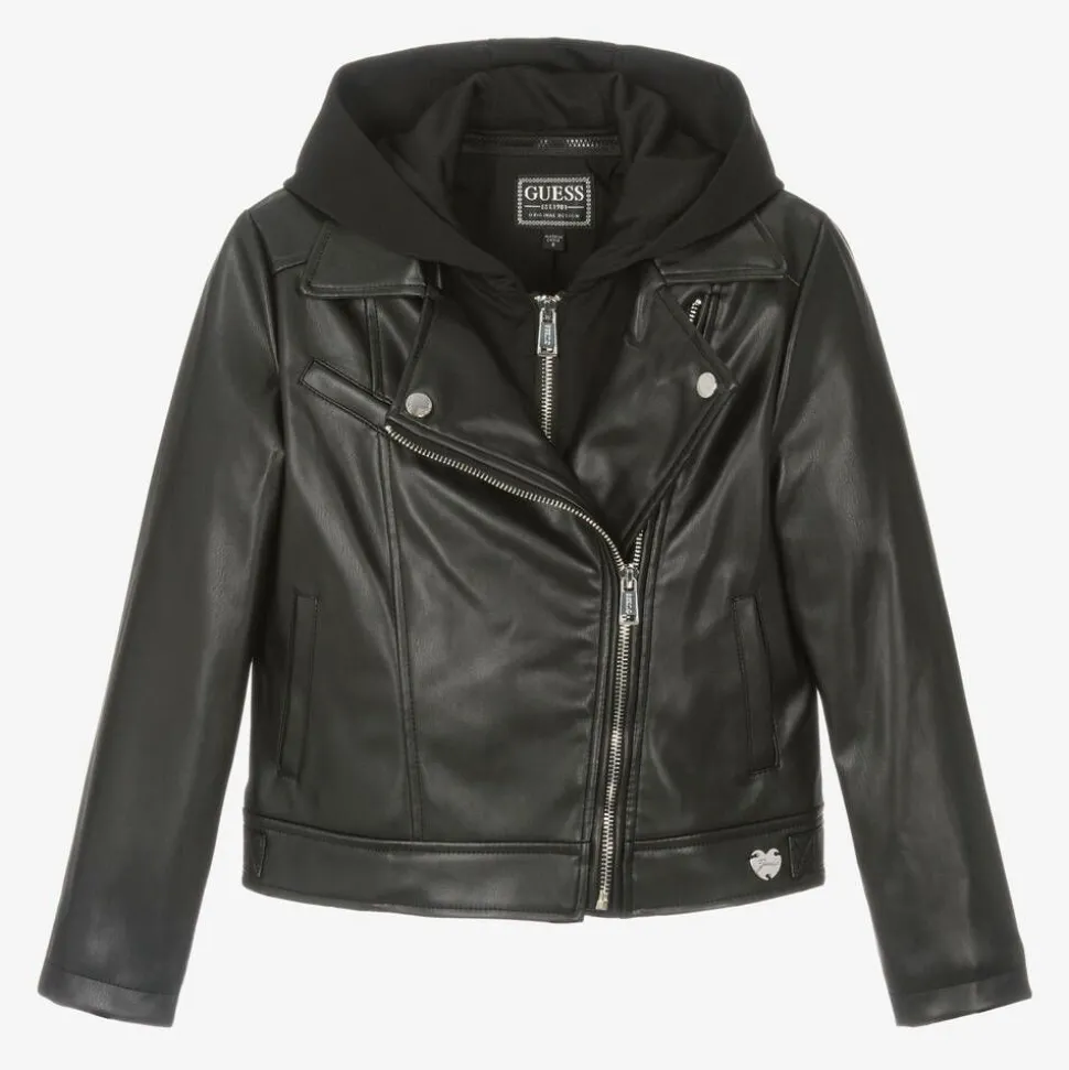 A black biker jacket for girls by Guess, made in faux leather. With a double-layered look, this cool jacket has a detachable, zip-on hood panel made in soft jersey. The jacket has handy side pockets and a silky lining for comfort. It is designed with edgy silver-tone hardware, a heart-shaped logo charm on the hem, and branded faux poppers on the lapels. Both the jacket and hood panel fasten easily with zips on the front.