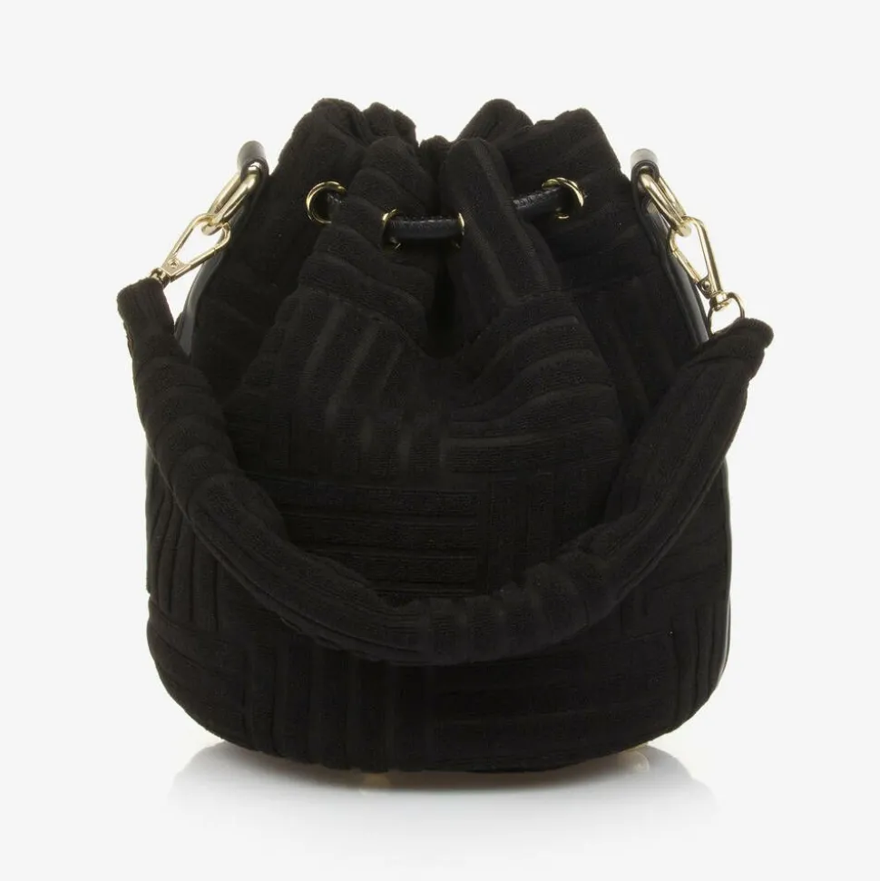 Stylish black bucket-style bag for girls by Fun & Fun, with tonal felted detailing. The spacious compartment can be secured with the drawstring fastening and a choice of two straps means it can be worn as a shoulder or handbag.