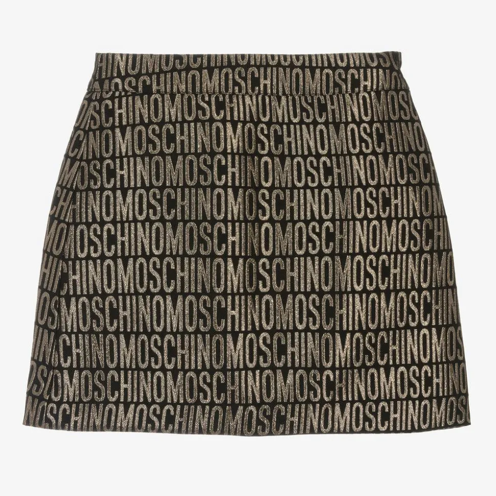 Stand-out black Mini-me skirt for girls by luxury brand Moschino Kid-Teen, patterned with glittery gold jacquard logos. For comfort, it is fully lined and smaller sizes have an adjustable waist for a great fit. It fastens with a neat, concealed zip on one side.