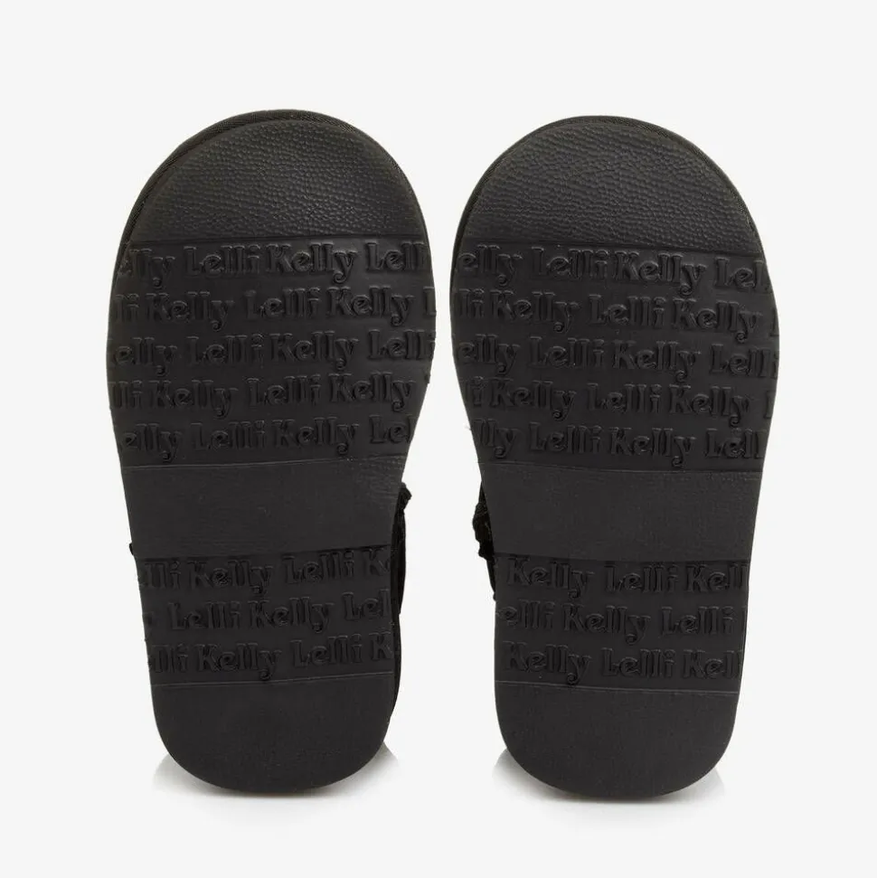 Cute black suede leather boots for girls by Lelli Kelly, patterned with embroidered hearts and diamantés. They have a black and beige logo tab on the heels and a super cosy, faux shearling lining and insole. With a non-slip rubber outsole, they are easy to wear and just pull on.