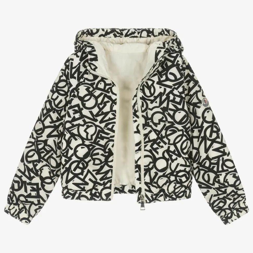 A black and ivory jacket for girls by luxury brand Moncler Enfant, with a bold logo pattern. Smooth and lightweight, this hooded jacket is fully lined for extra comfort and fastens with a branded zip on the front. The pockets hidden in the side seams fasten with poppers and there is an iconic patch on one sleeve for a signature finish.