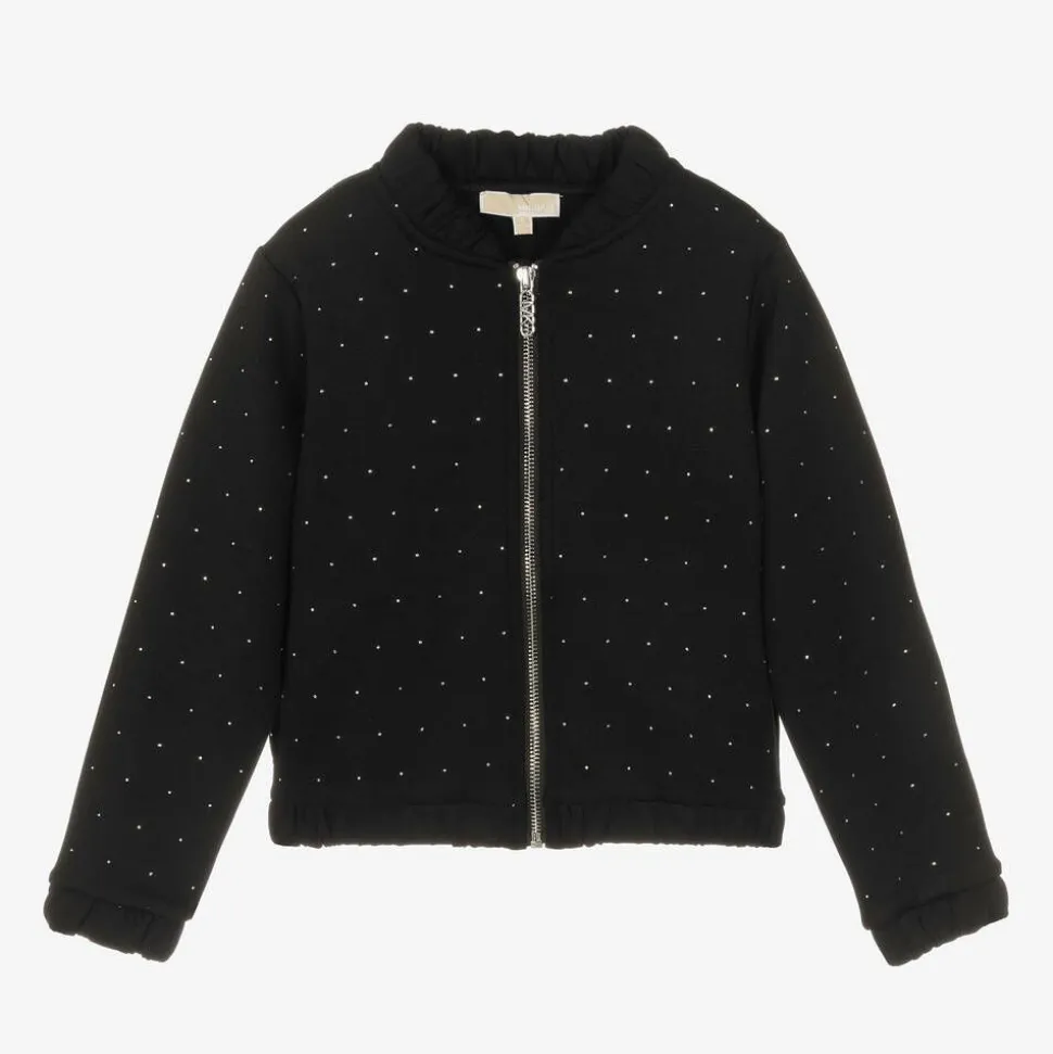 Mini-me black zip-up top for girls by Michael Kors Kids, made in a soft and comfortable viscose jersey blend. Adding a touch of glamour to the casual design, this stylish top is detailed all over with sparkling diamanté studs. It has ruched elasticated trims on the collar, cuffs and hem and fastens with a silver zip that features the brand's MK Empire logo on the zip pull, for a subtle designer finish.
