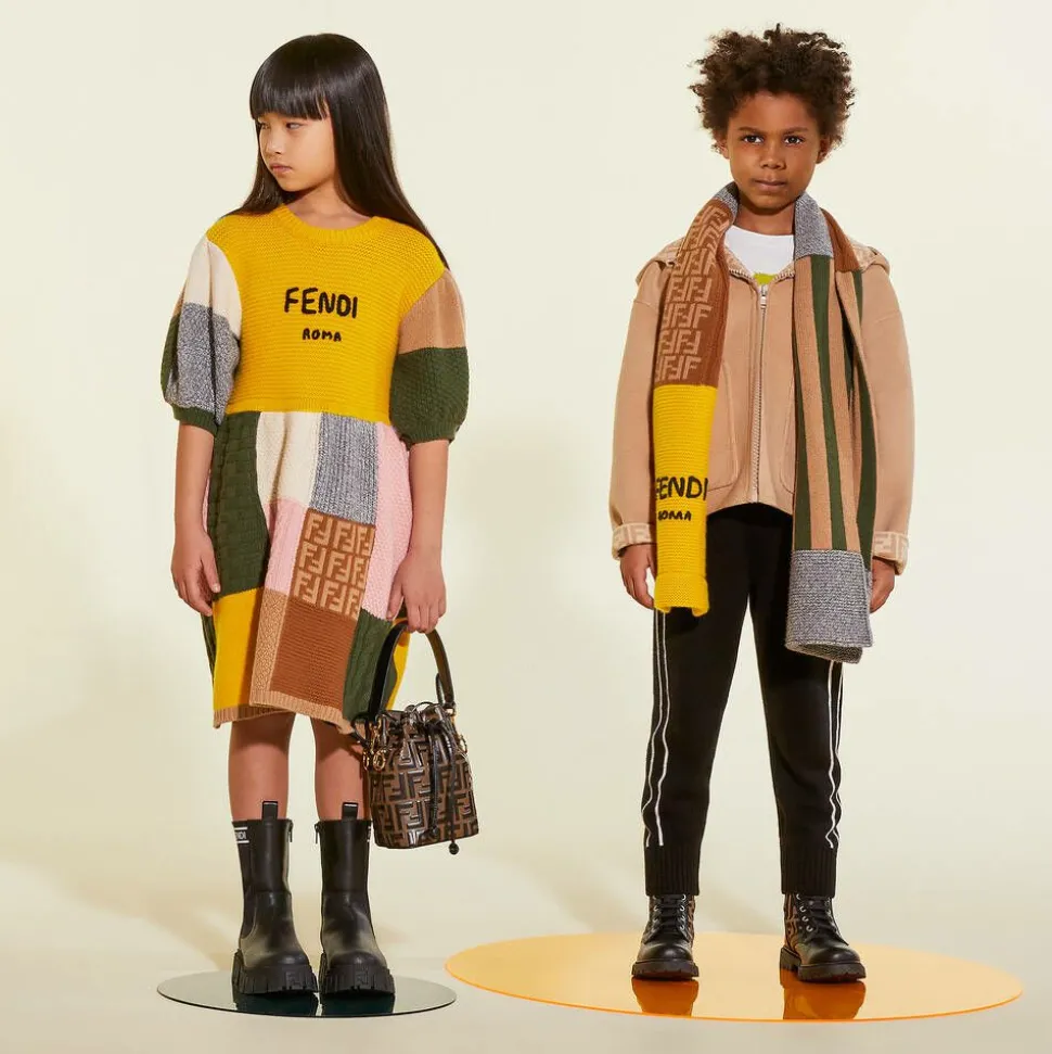 Girls cool black leather boots, by luxury Italian brand Fendi. With a stylish chunky sole embossed with the signature FF logo, they have the brand's logo knitted on the stretchy ribbed trims, and a black logo tape on the back for a cool, edgy look.