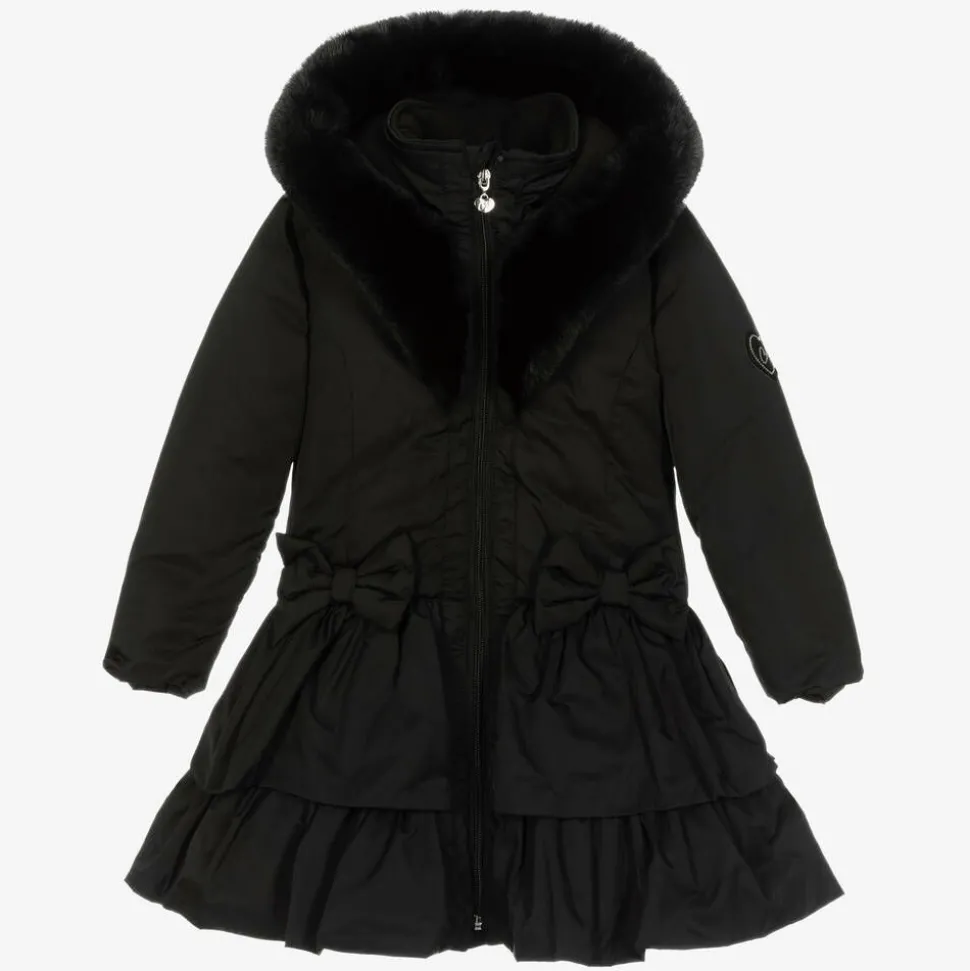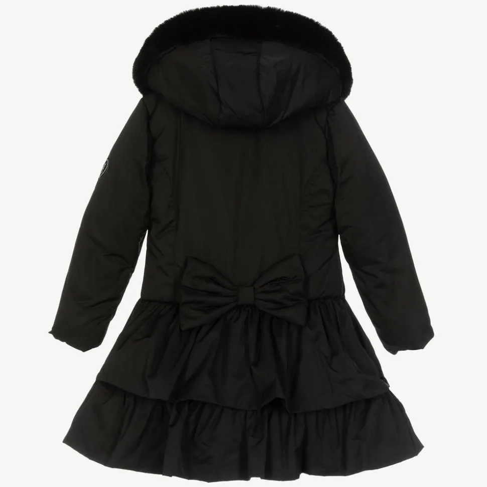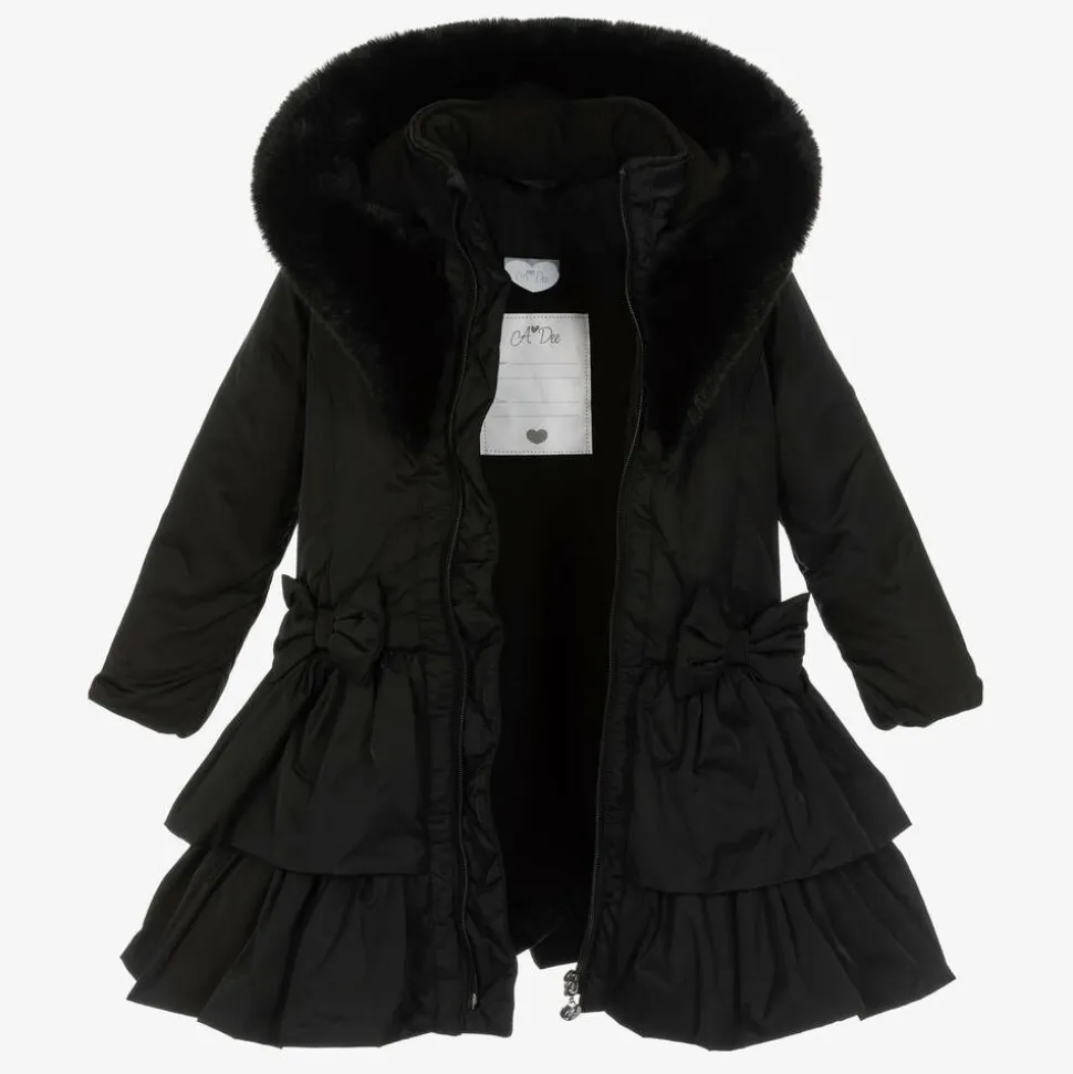 Lovely black hooded coat for girls by A Dee, made in a smooth, silky fabric and lined with soft fleece for cosiness. Warmly padded, it has concealed side seam pockets, gently elasticated cuffs and a large hood trimmed with soft plush faux fur, for extra protection against the elements. There are ruffle trims on the peplum-shaped hem, with stylish bows on both the front and back giving a pretty finish. It fastens with an easy-to-use zip on the front and has a gorgeous sequin logo on one sleeve, adding a sparkly designer touch.