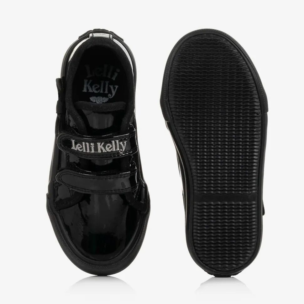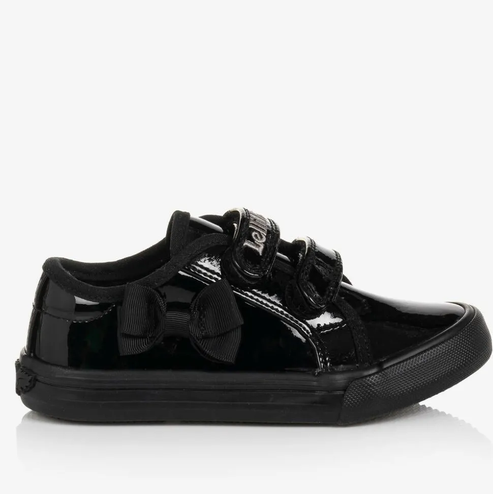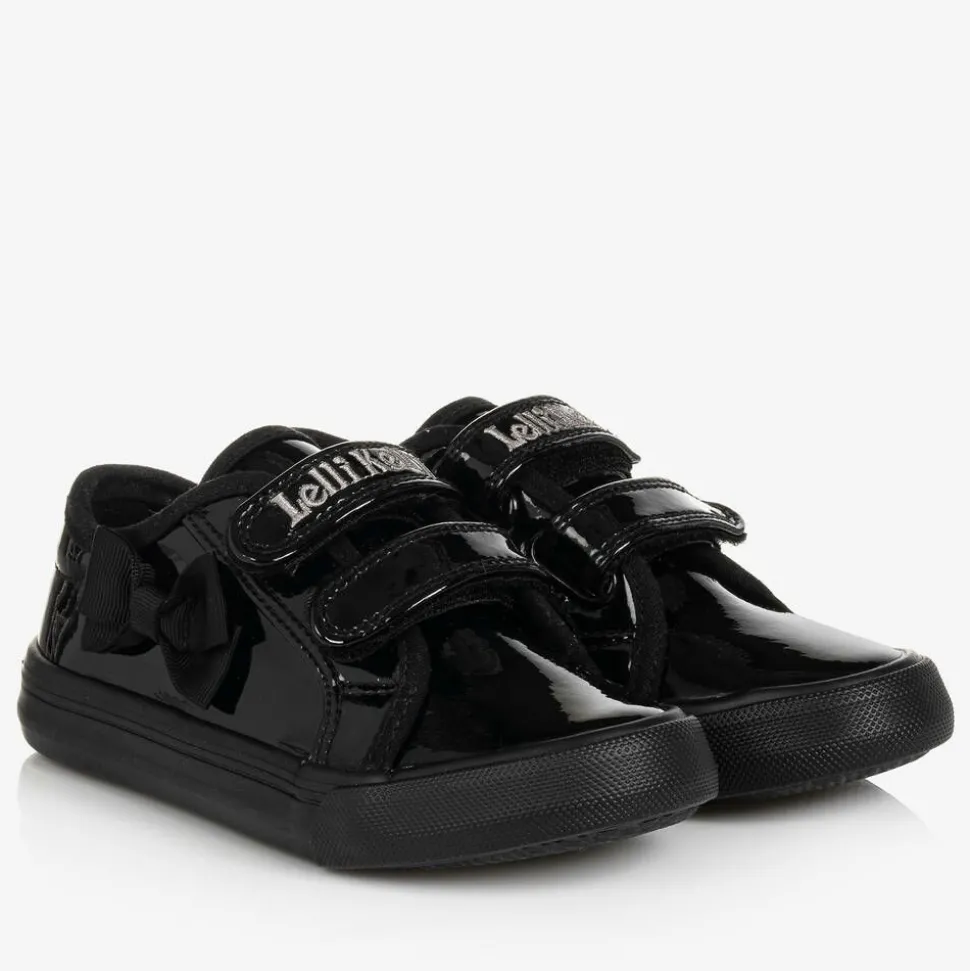 Black patent canvas trainers for girls by Lelli Kelly, detailed with a cute grosgrain bow on one side. Ideal as school shoes, these sporty trainers are easy for little ones to get on and off with velcro fastening straps. They have a cushioned insole and textile lining, as well as a ridged rubber outsole for good grip. The designer's name is embroidered over the strap in grey to complete the look.