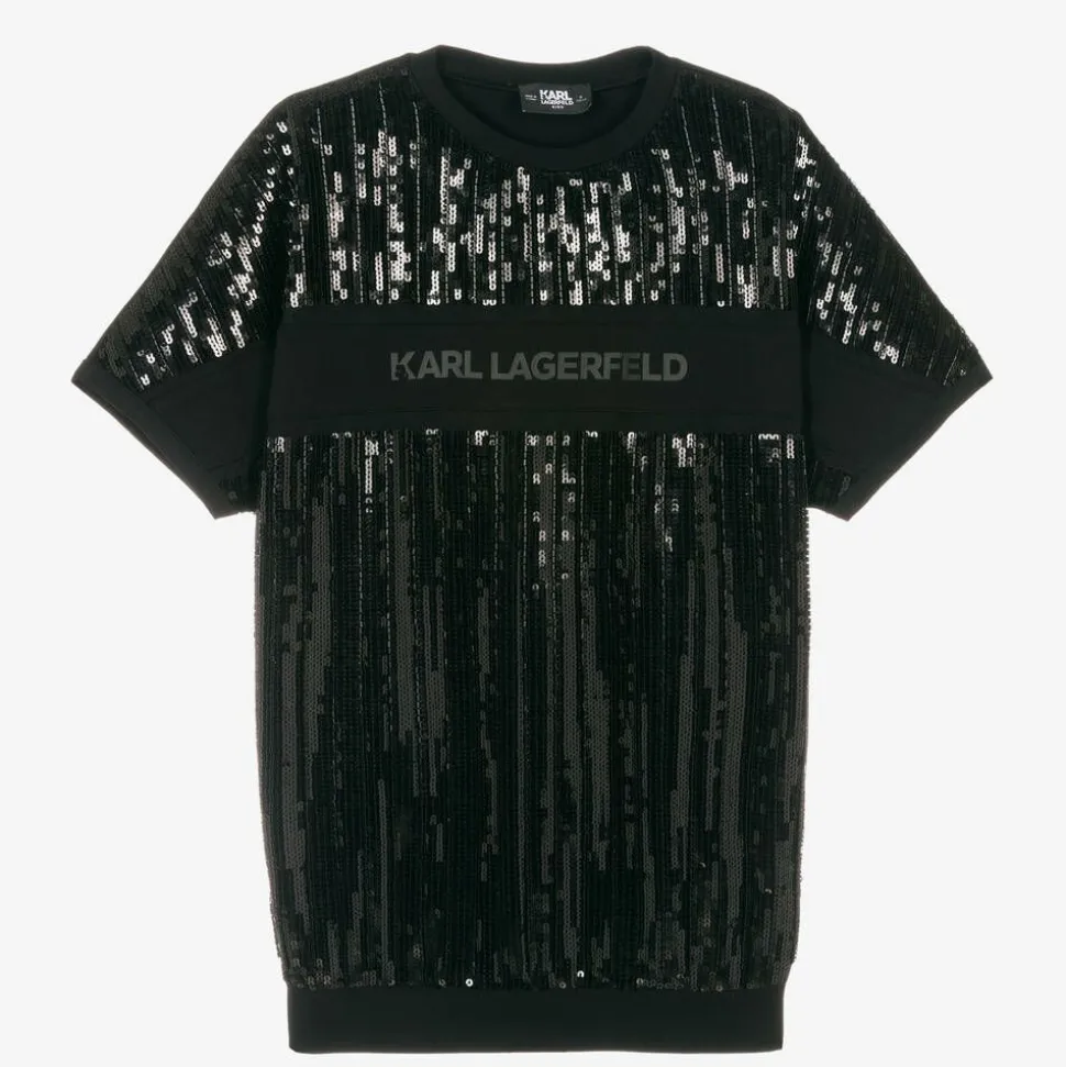 A relaxed black T-shirt style dress for girls by KARL LAGERFELD KIDS, with seamless short sleeves. In casual and laid-back silhouette, it is stitched with shiny black sequins and beads on the front for an eye-catching finish. Made from soft cotton jersey, it has a panel across the chest with subtle mesh trims and a tonal logo printed on the front for a branded finish.