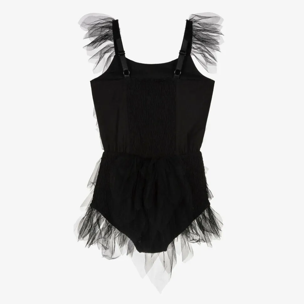 A stylish black costume for girls by Tutu du Monde, ideal for the spooky season. Beautifully hand-embellished with sparkling sequins, this fun bodysuit is trimmed with wisps of delicate tulle, creating a gorgeous feather effect. It is made in soft cotton, with adjustable shoulder straps and a gently elasticated waistband. The back is ruched for comfort, with statement ruffle plumes completing the look. Items are made to last and become more lovely with wear as slight fading and fraying edges adds to their charm.