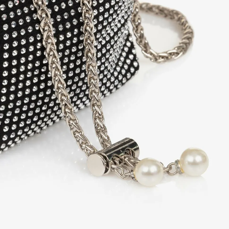 Edgey black handbag for girls by Fun & Fun. The felted fabric is embellished with diamantés and the compartment secures closed with a chain drawstring fastening which matches the detachable strap.