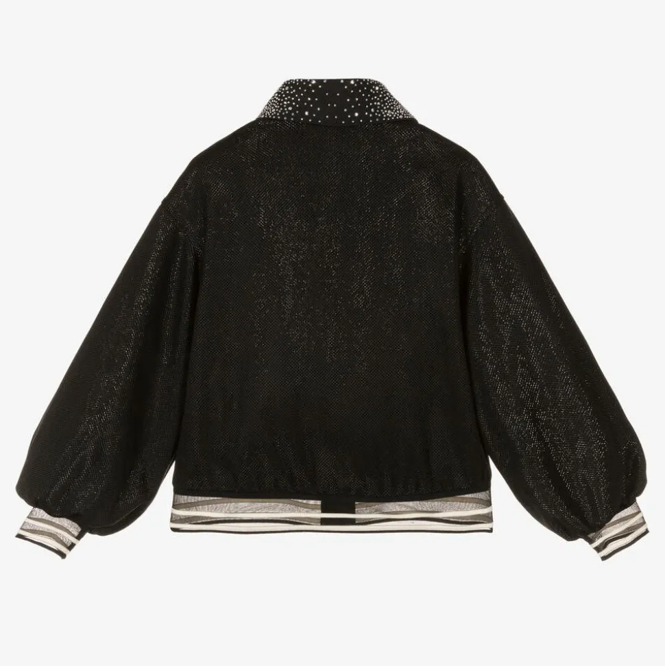 Smooth and sparkly with a lightweight lining, this black long-sleeved zip-up top for girls is by KARL LAGERFELD KIDS. Fastening with a tonal zip on the front, it has a diamanté-embellished pointed collar featuring a silver glittery logo design on one side. Ideal for a casual yet shimmery look, it has ivory and black striped mesh trims on the cuffs and the hemline for a sports luxe look.