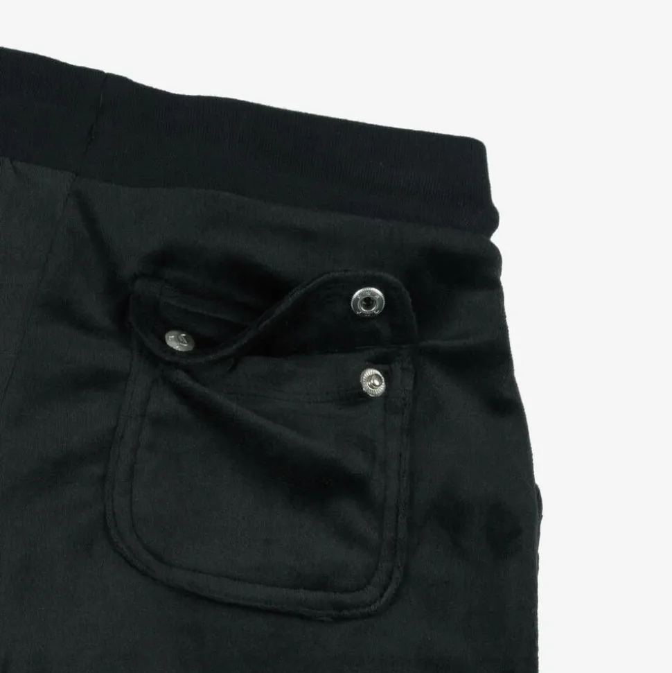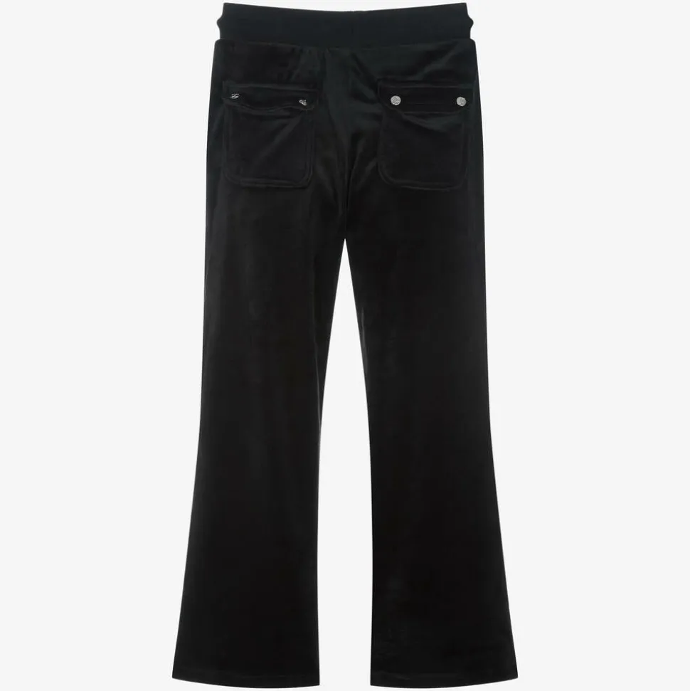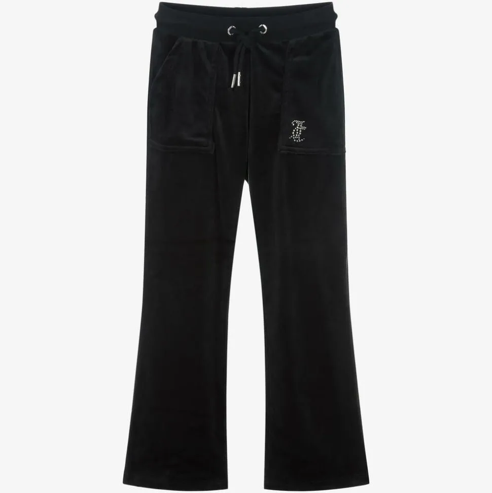 Black wide leg joggers for girls by Juicy Couture, made in super soft velour. They have an instantly recognisable, iridescent, diamanté logo sparkling on one of the front patch pockets, and popper-fastening flap pockets around the back. A drawstring waist ensures a great fit.