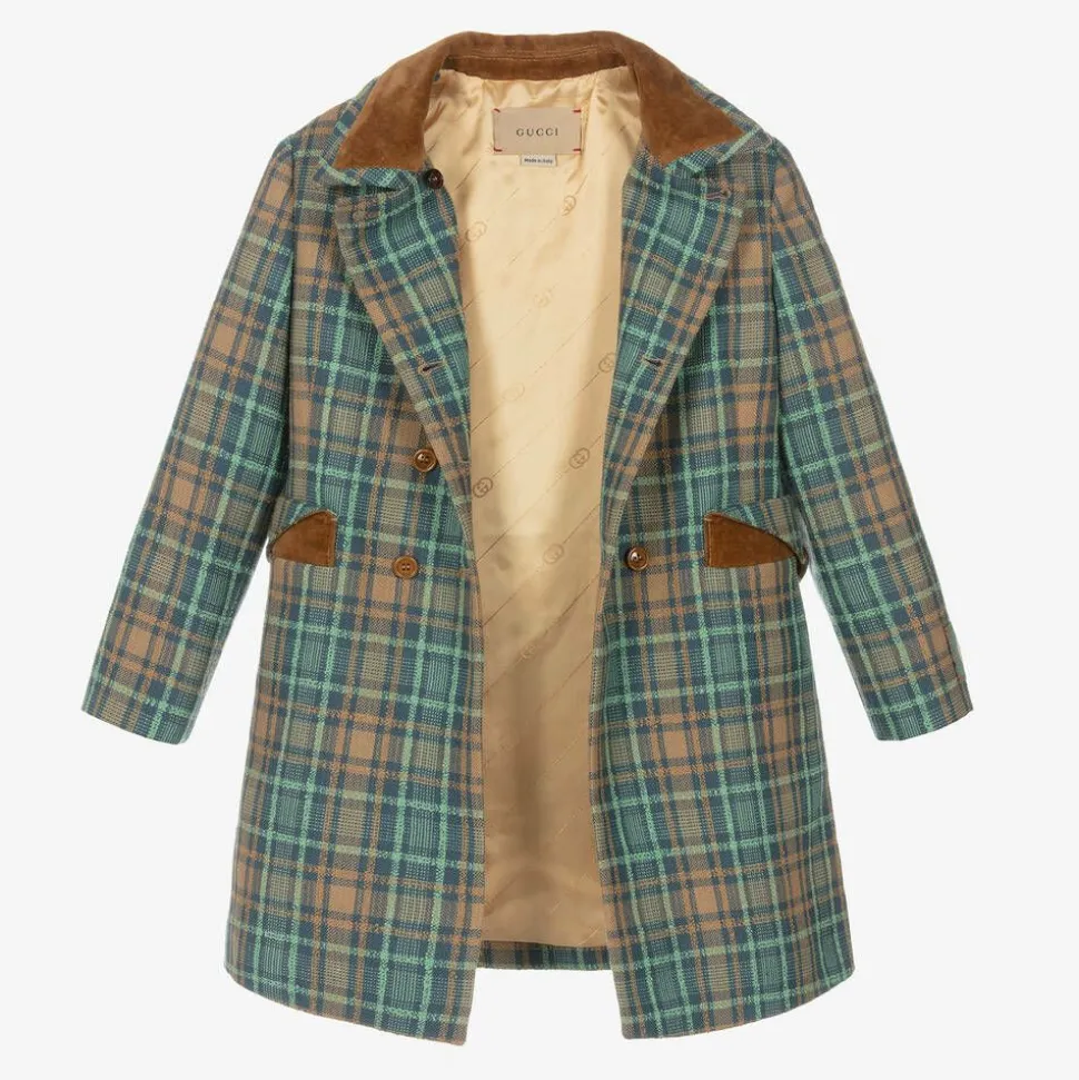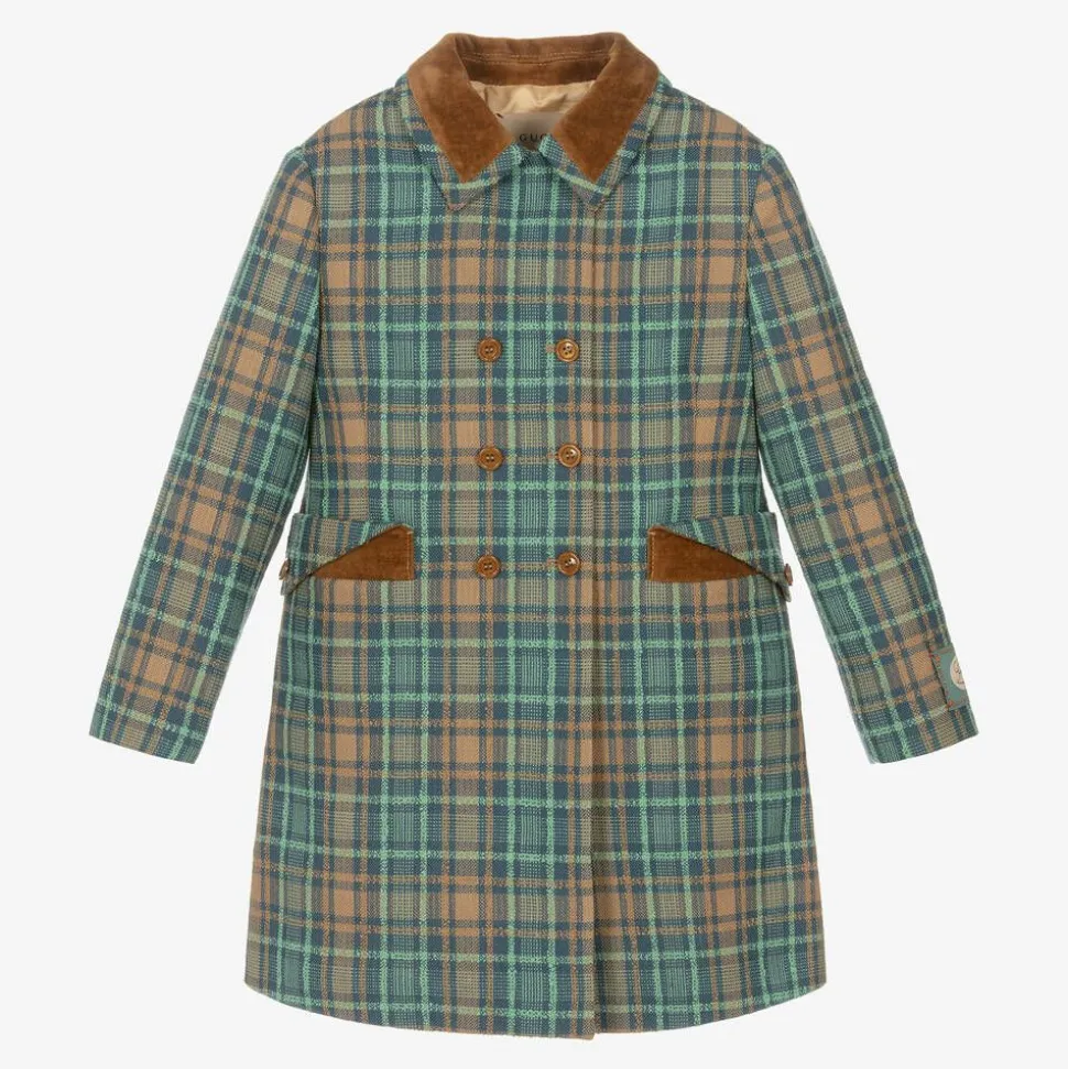 Blue wool coat for girls by luxury Italian brand Gucci, woven in a textured brown and green check. This smart, double-breasted design has round button fastenings on the front and velvet trims on the collar and front pockets for an elegant feel. It is complete with a Gucci script logo label on one cuff, bordered with lovely orange flowers. The silky soft viscose lining is patterned with the brand's signature Interlocking G for that all-important finishing touch.