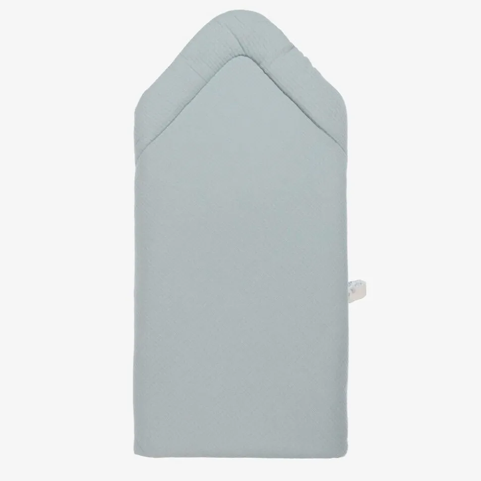 Warmly padded pale blue cotton nest for baby girls by Jamiks, with a basket weave effect and a white and shiny silver crest logo badge on the front. In a wrap-around style, it is secured on one side with velcro and white and pale blue floral ties. Matching the ties, there is a pretty floral, cotton twill lining for comfort.
