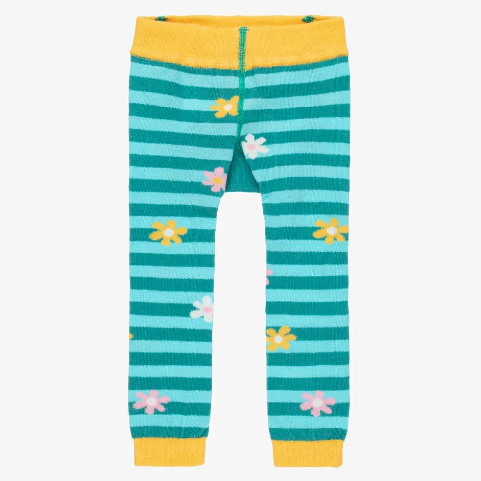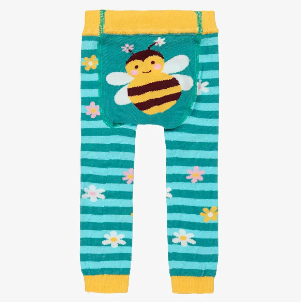 Little girls blue leggings by Powell Craft, made in a soft cotton knit. They have a striped pattern with flowers and a bumblebee motif. They are soft and stretchy, and can also be worn as footless tights.