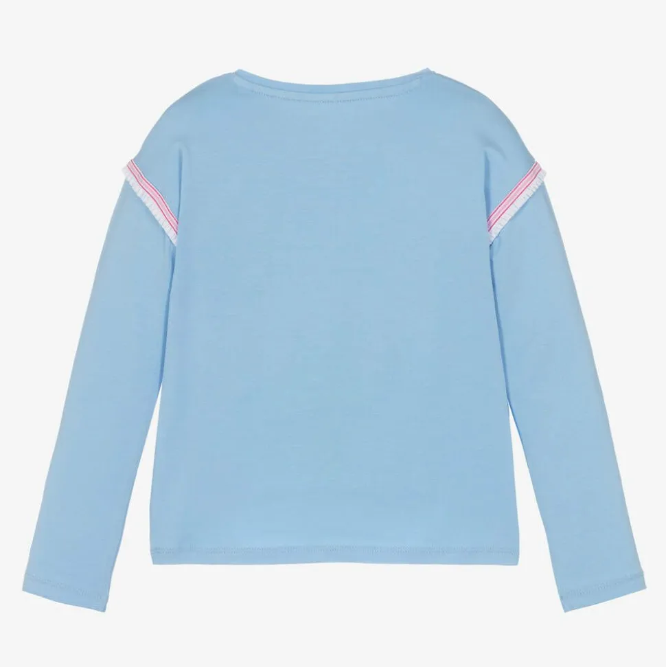 A lovely blue long-sleeved top by Guess, made from soft cotton jersey. The branded design on the chest has bouclé appliqué patches stitched with shiny sequins and features a cute teddy bear head and the phrase 'be brave' for a fun look. There are striped frilled trims on the dropped shoulder seams for a sweet finish. This item contains organic cotton fibre.