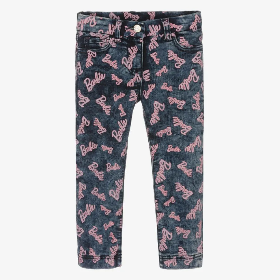 Fun blue denim jeans for girls by Monnalisa, with the pink Barbie logo printed all over. Made in a soft cotton mix with stretch for comfort, these acid-wash jeans have a classic regular fit.