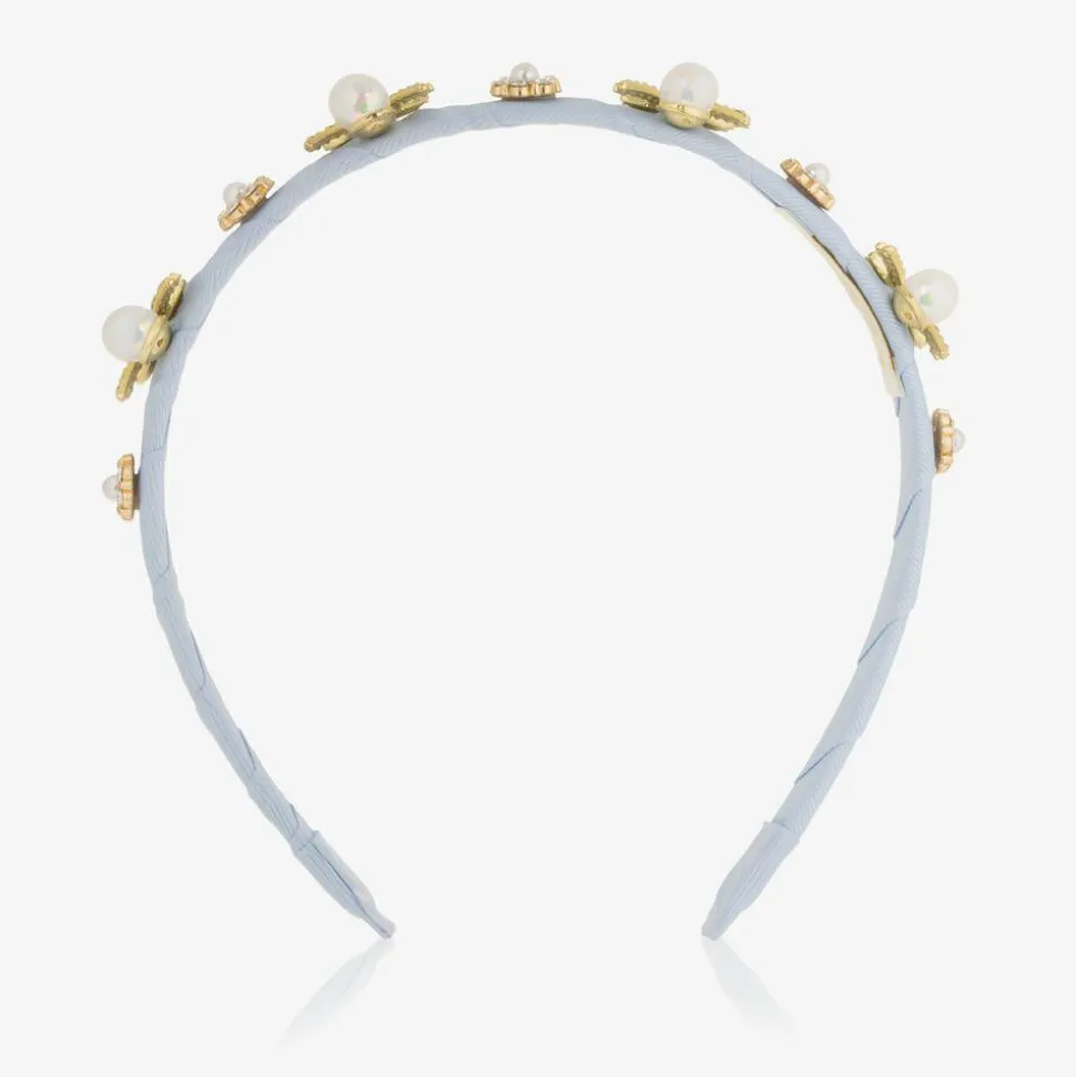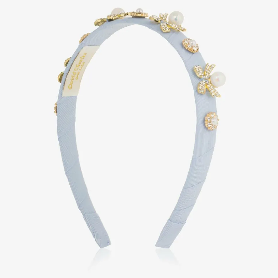 A pretty pale blue hairband for girls from David Charles. The flexible band is covered with ribbon and adorned with sparkly bow and flower charms.