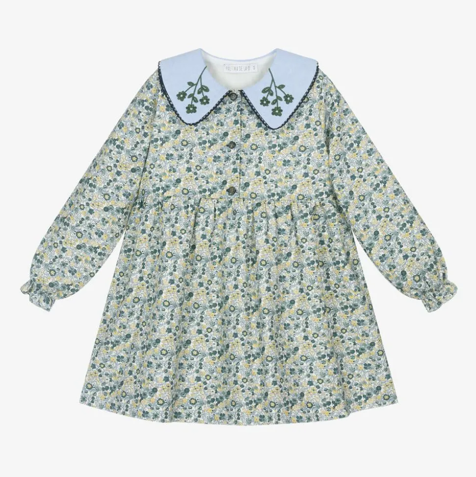 A blue dress for girls by Spanish brand Paloma de la O. It is made in soft cotton twill and patterned in a pretty floral print in shades of blue and pastel chartreuse green. It has a contrasting blue, Oxford cotton collar, trimmed in delicate lace and decorated with beautiful floral embroidery. Lined in lightweight voile for comfort, this traditional style has frilly cuffs on the long sleeves and fastens with tonal buttons on the front.