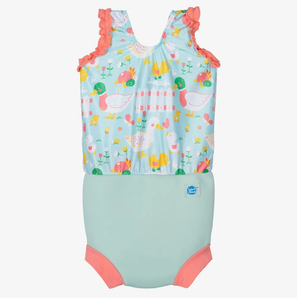 An adorable light blue swimsuit for little girls by Splash About, made in silky smooth and stretchy fabric on the upper body with UPF 50+. The sleeveless top is designed in a brightly coloured duck print with pink ruffle trims on the wide shoulder straps. Recommended by swim schools, it has a built-in swim nappy on the lower body made from soft and supple neoprene which fits securely on the waist and thighs to minimise the risk of leaks in the pool. It can be worn alone or with the brand's liners for extra protection and ease of cleaning.
