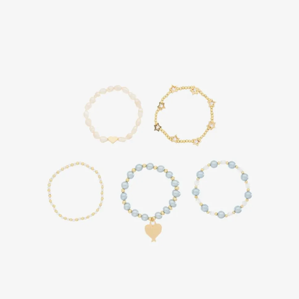 Pretty blue, ivory, and gold bracelets for girls by Angel's Face, in a lovely pack of five. Delightful accessories that add a sweet finish to any outfit, the beads are a mix of blue and ivory faux pearls, shiny gold diamanté stars, a heart, and an iconic angel-wings logo charm. They are made from stretchy elastic for comfortable wear.