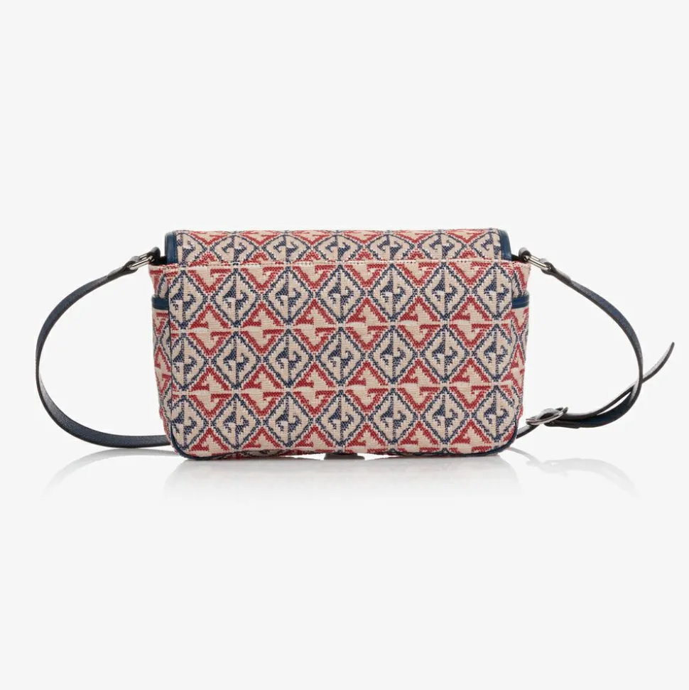 Lovely navy blue and red shoulder bag for girls by Italian luxury brand Gucci, made from a mid-weight woven fabric with a silky lining. It has a gorgeous all-over geometric GG logo pattern, with a navy blue Interlocking G logo patch and matching trims. There is a silky lining, an adjustable shoulder strap and magnetic snap closure on the bottom.