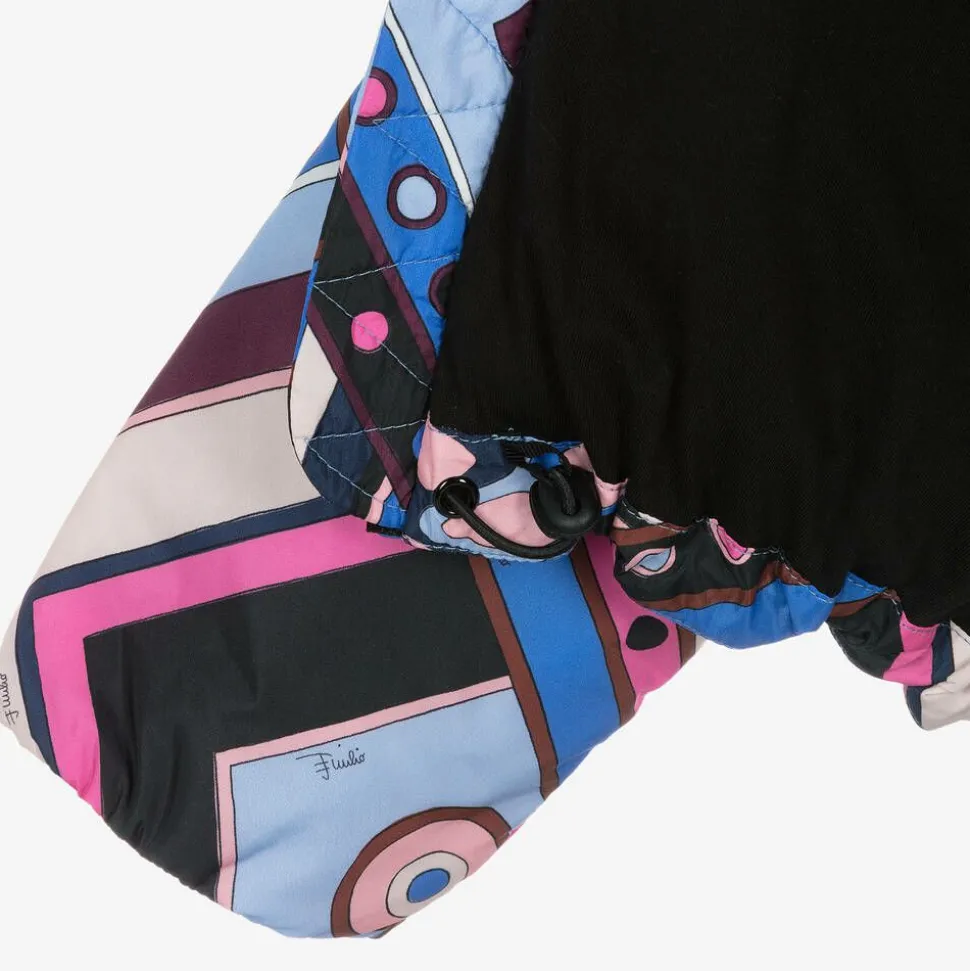 A blue puffer jacket for girls by luxury label PUCCI, with lightweight padding for warmth. Bold and striking, the silky fabric features the designer's archival Vivara print with black and pink detailing. Lined with comfortable cotton jersey, it has an inner drawcord on the hem to adjust the width, elasticated cuffs for cosiness, and a silver-coloured front zip in the shape of the brand's famous overlapping fish motif. This boxy-fit jacket has useful side pockets.