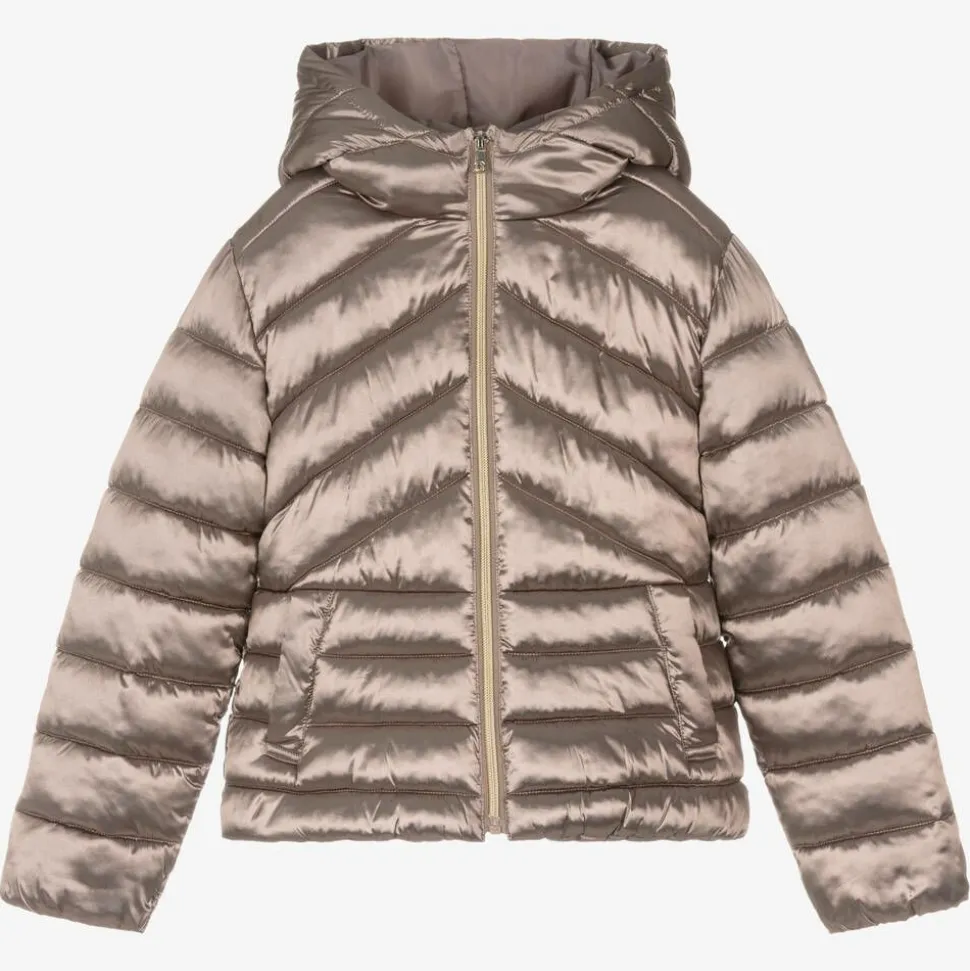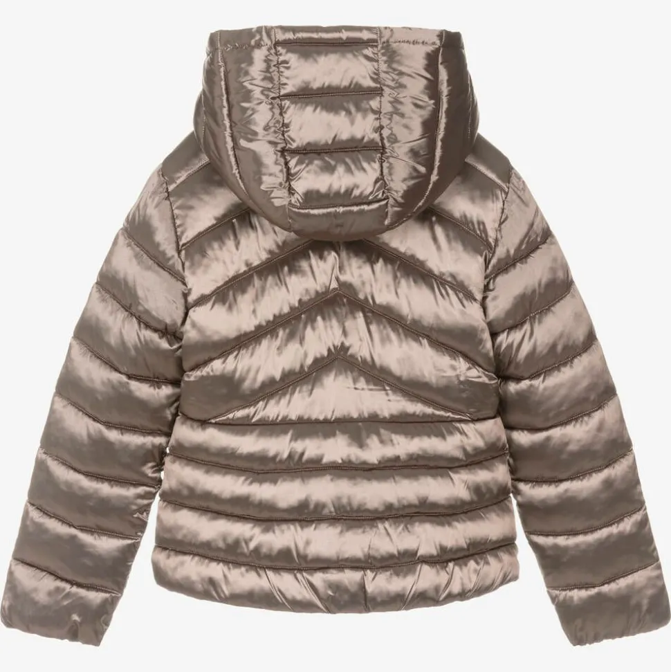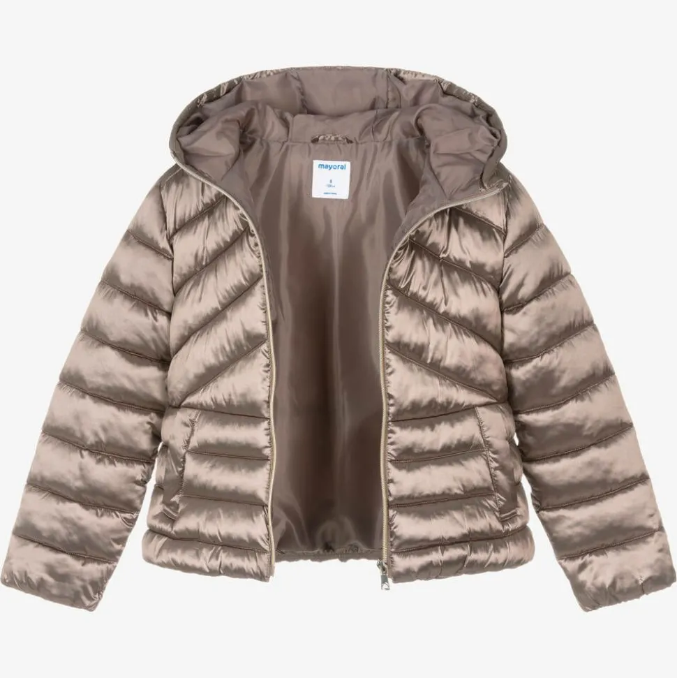 A brown puffer jacket for girls by Mayoral, padded with recycled fibres. Warm yet lightweight, this stylish jacket has a gold zip fastening, a hood, and side seam pockets.