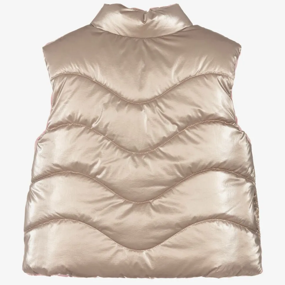 Fun gold and pink reversible gilet for little girls by Mayoral. Lightly padded for added warmth without extra weight, this quilted gilet fastens with a zip on the front. The gold side has concealed pockets in the side seams and is finished with a delicate logo tile on the chest, whilst the pink side is patterned with subtle tonal polka dots for a pretty look.