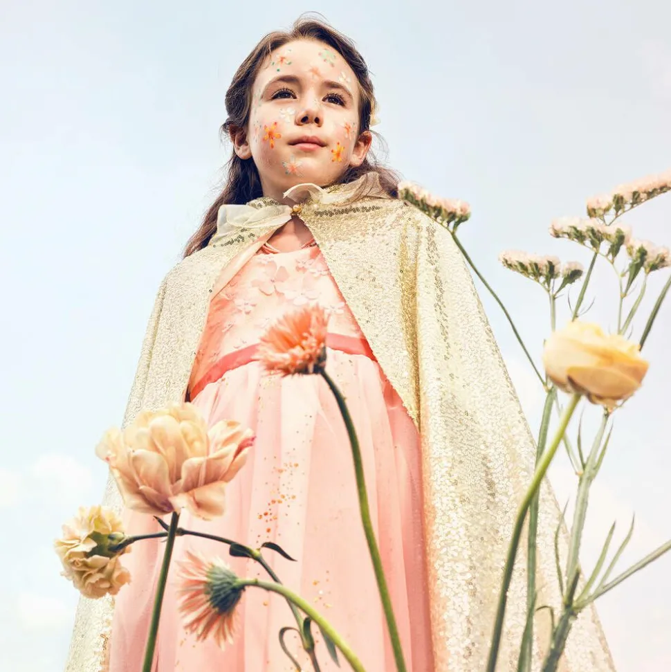 A magical gold cape costume for girls by Souza, great for stimulating the imagination. This hooded layering piece has sparkly sequins and a ruffled tulle collar to create super fun looks. It fastens with faux pearl buttons and has a silky soft lining.