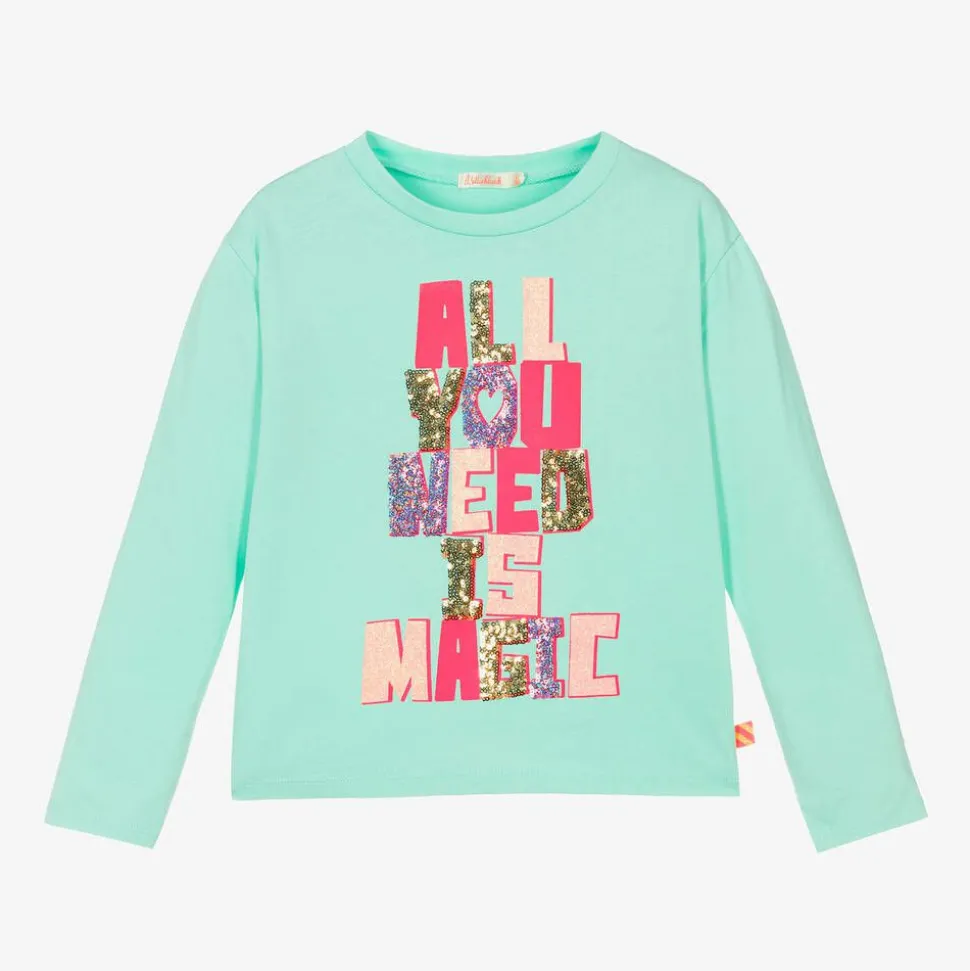 Sea green top for girls by Billieblush, made in cotton jersey for a soft and comfortable feel. This long-sleeved style is printed with a neon pink slogan that reads 'All you need is magic'. Some of the letters are detailed with gold and purple sequins for extra sparkle.