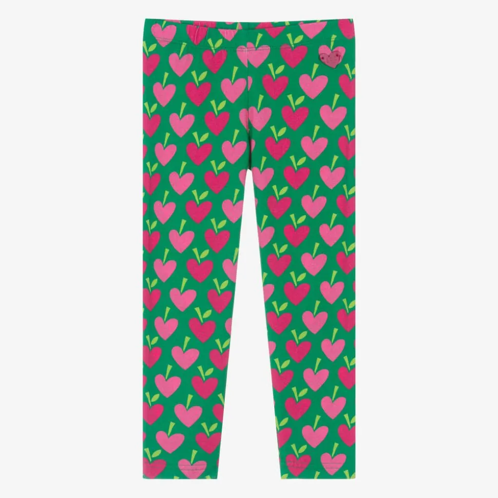 Green leggings for girls by Agatha Ruiz de la Prada, made in soft and stretchy cotton jersey. Bright and colourful, these long leggings have a fun pink heart-shaped strawberrry pattern. Casual and comfortable, they have an elasticated waistband and a heart-shaped logo charm on the front.