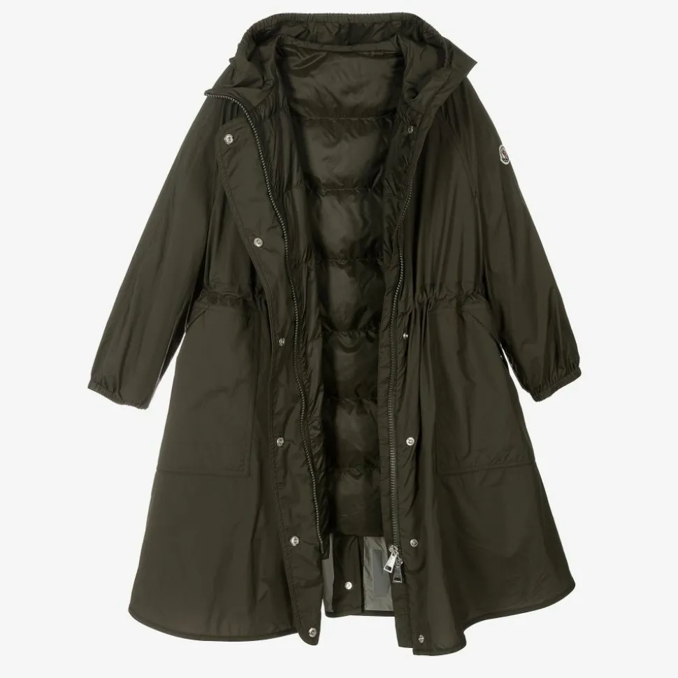 Khaki green 'Lin' parka for girls by luxury French designer Moncler Enfant, with the brand's signature felted logo badge on one sleeve. Made in the brand's matte, high density, lightweight longue saison opaque nylon, it is water repellent and has a down-padded lining. The coat has an attached hood with an elasticated brim and cuffs, as well as an adjustable, internal drawstring and front pockets. Around the back the vent fastens with logo poppers and the brand's reflective silver logo is printed along the hemline.