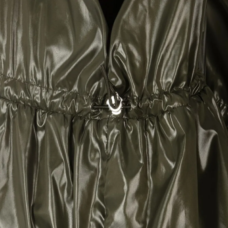 Khaki green parka for girls by luxury brand Moncler Enfant. Made in the brand's lightweight longue saison opaque nylon, it is water repellent and has a nylon laquƩ lining. There is an attached hood with an elasticated brim and a chin guard over the front zip, which is secured with poppers. There are chest pockets and concealed side pockets, with frills on the sleeves and around the waist. The elasticated hemline is longer around the back than the front.