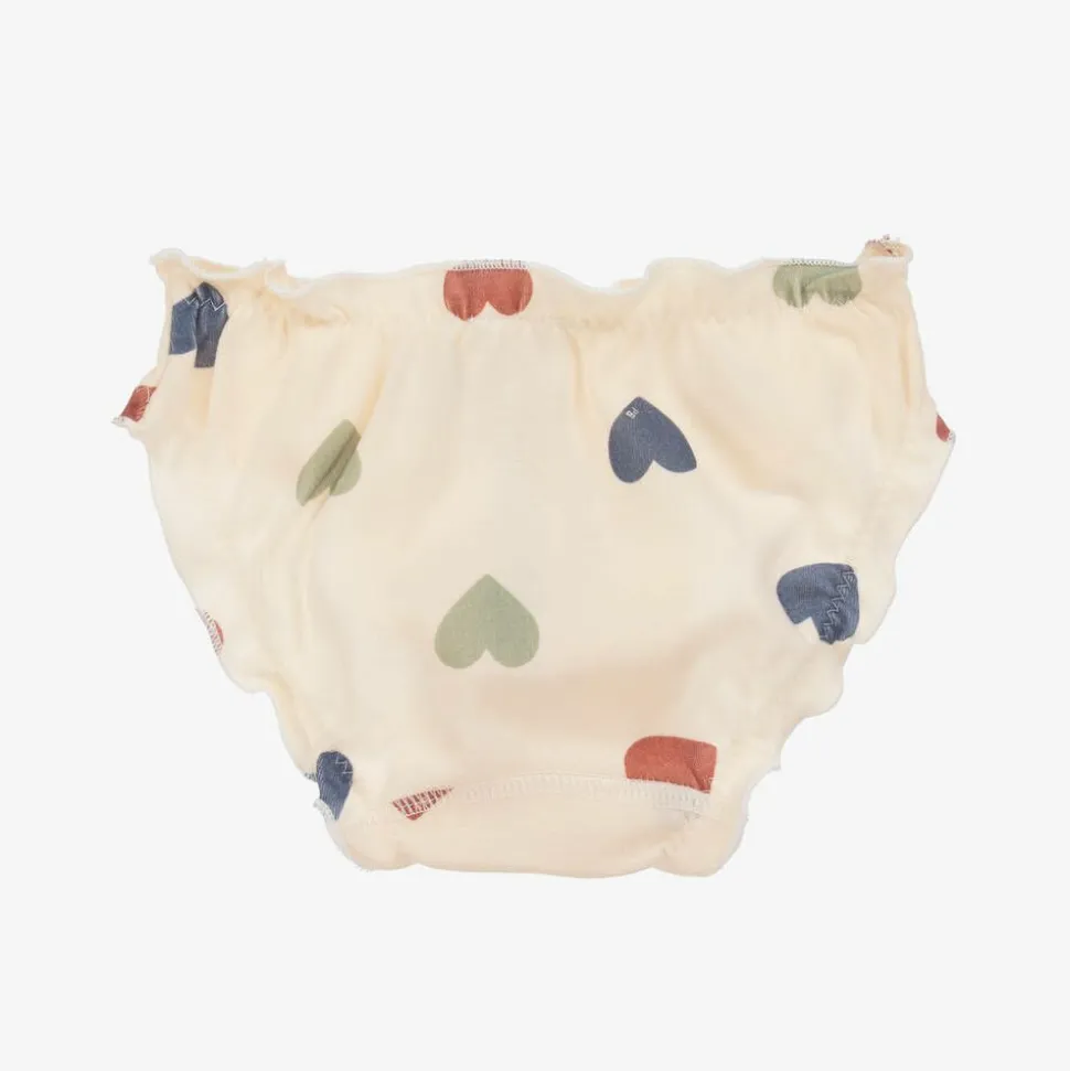 A three-pack of organic cotton knickers for girls by Petit Bateau, in ivory, terracotta red and pale green. Made in soft jersey and trimmed with frilled edges, one pair are patterned with hearts, the second are striped, and the third are plain.