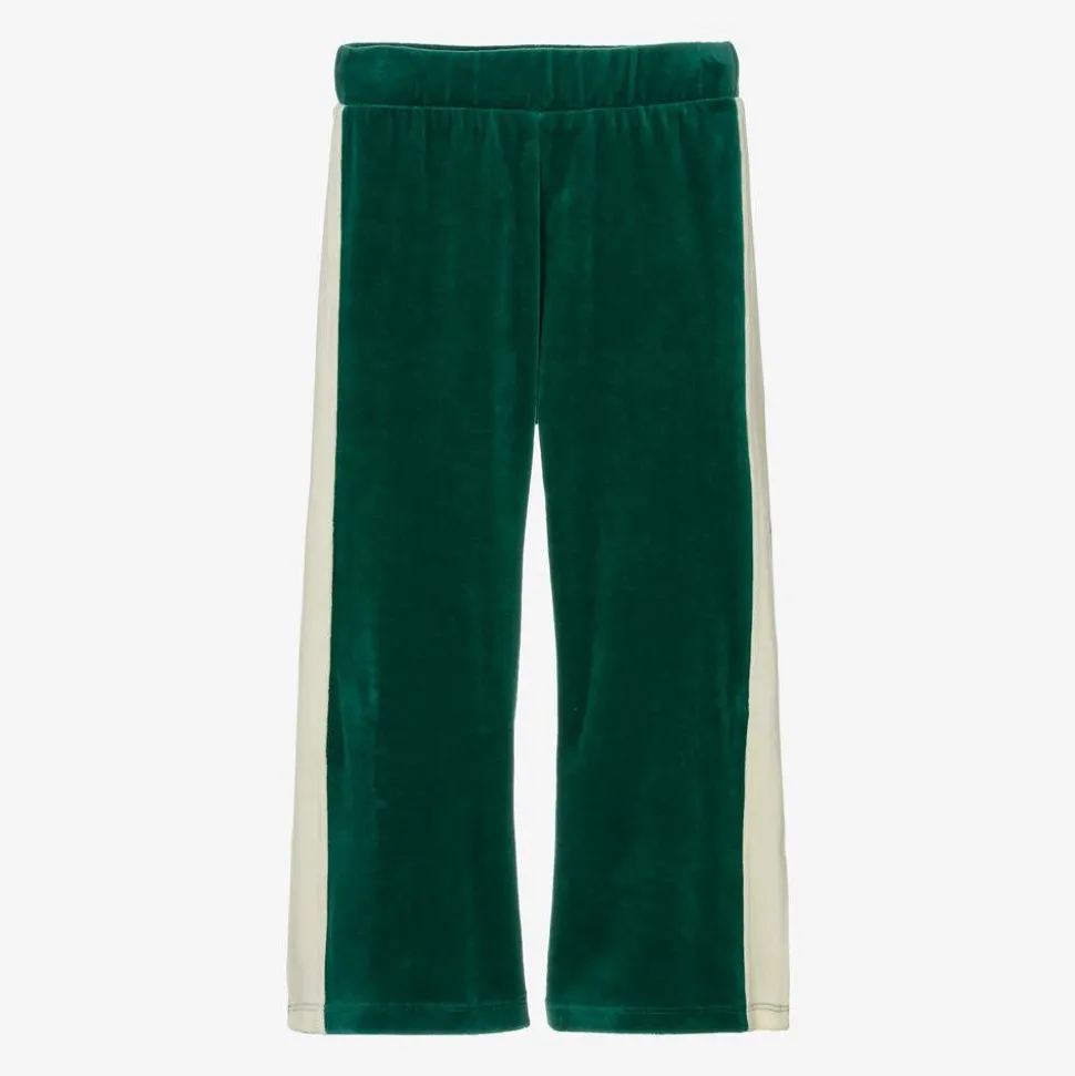 From Mini Rodini for girls, a pair of green velour joggers made from organic cotton. Cool and casual, these comfortable trousers have an elasticated waist which can be secured with an internal drawstring.