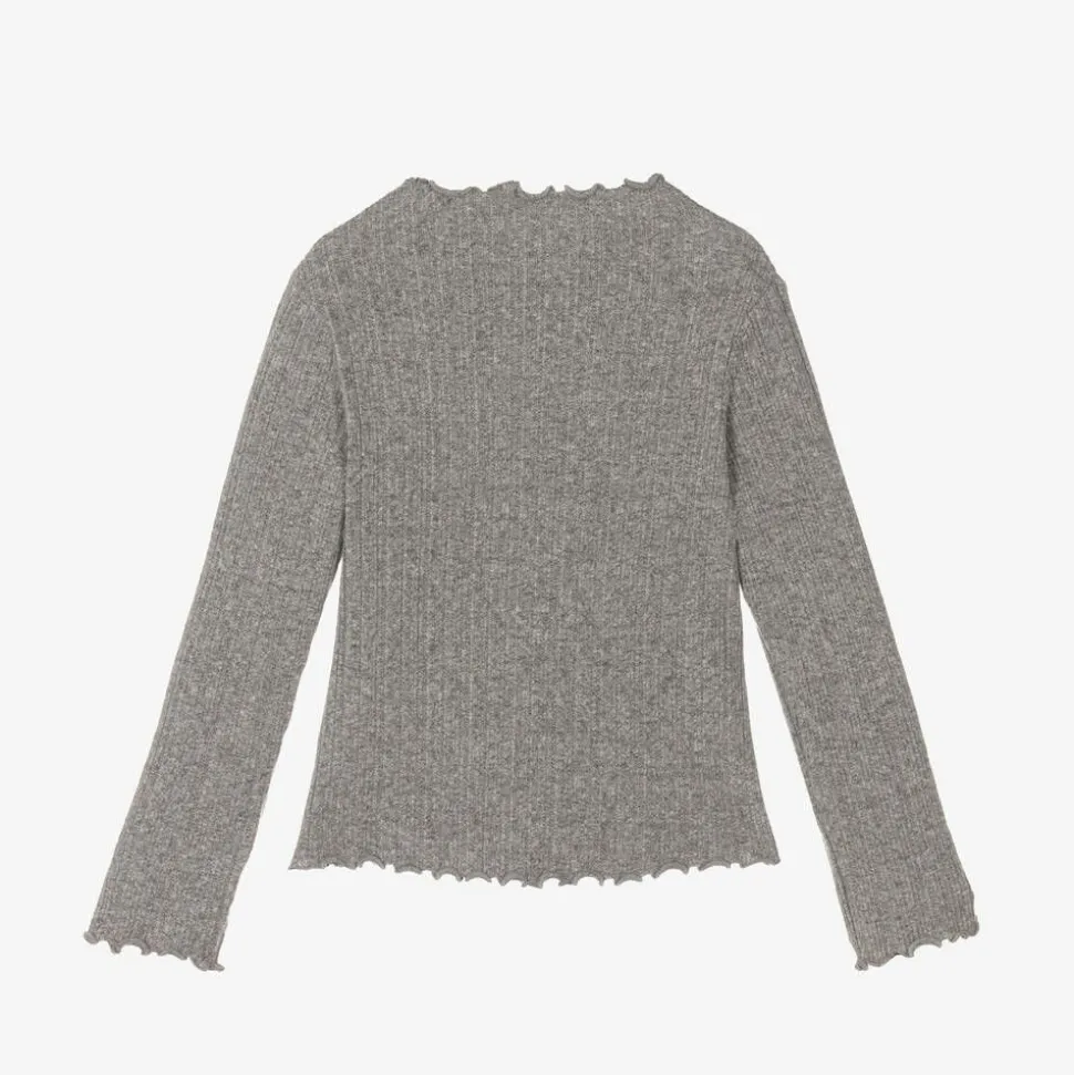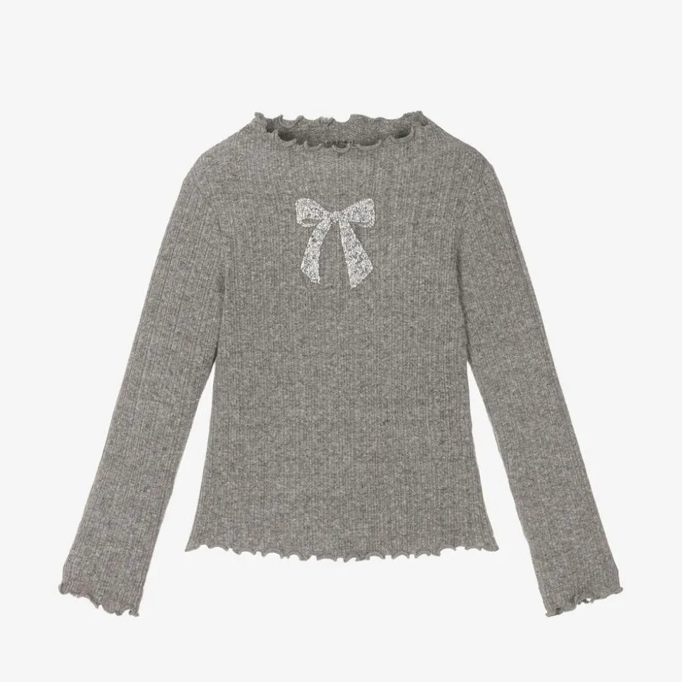 A lovely grey jersey top for girls by Name It. Ideal for adding a touch of sparkle to her casual wardrobe, it has a twinkling diamanté bow detail on the front. It is made in a soft organic cotton blend and has pretty, curled trims.