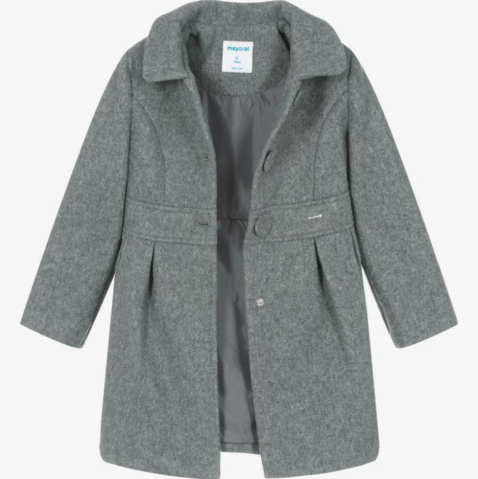 A traditional-style grey marl coat for girls by Spanish brand Mayoral, made in a soft felted fabric. Easy to wear, this coat has a classic collar, button fastenings, and pockets on the front. It has a gold metal logo on the waist, with a pleated skirt and a silky smooth lining for comfort.