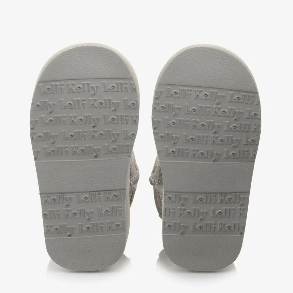 Cute pale grey suede leather boots for girls by Lelli Kelly, patterned with embroidered hearts and diamantés. They have a pale grey logo tab on the heels and a super cosy, faux shearling lining and insole. With a non-slip rubber outsole, they are easy to wear and just pull on.