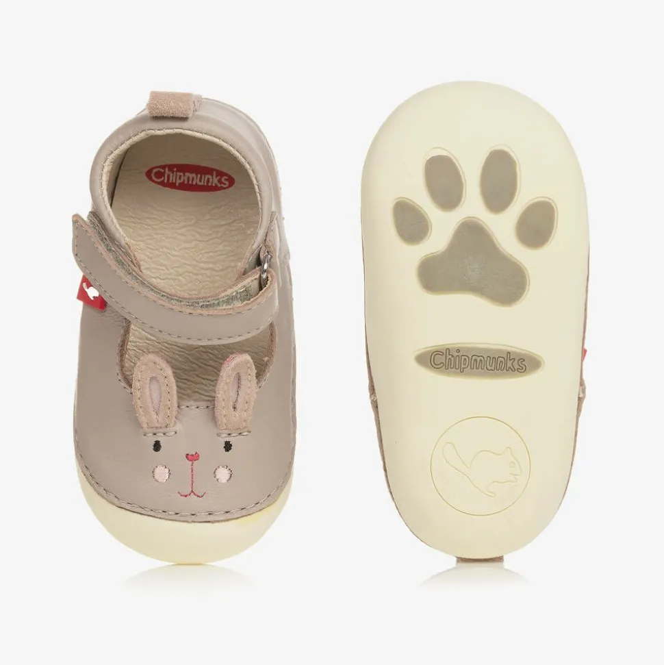 Grey leather first-walker shoes for girls by Chipmunks. Fastening with easy-to-use velcro, these lovely bar shoes have an adorable bunny rabbit embroidered on the front. Lined in soft faux leather, the rubberised sole is flexible and treaded with a paw print, just right for those first little steps.