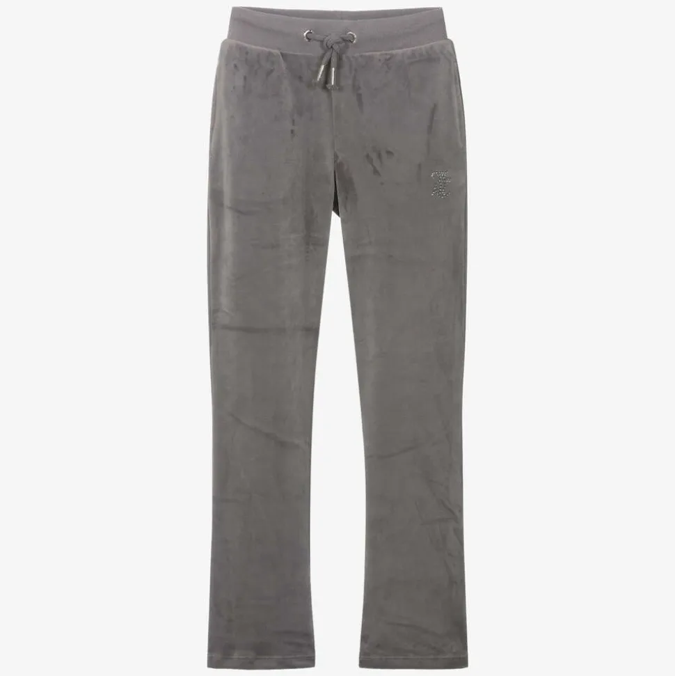 Lovely grey joggers for girls by Juicy Couture, made in the brand's signature velour. With stylish flared legs, they have a sparkly diamanté monogram logo on the front, adding a touch of glamour to the laid-back look. Super soft and stretchy for casual days or lounging, they have side seam and back pockets and a drawstring waistband for a comfortable fit.