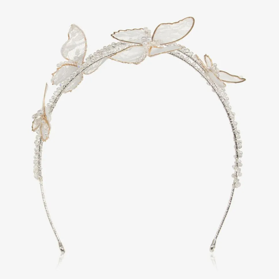 Stunning special occasion hairband for girls by Junona. A beautiful finishing touch to her outfit, this double stranded metal hairband is trimmed with ivory and crystal beads for a hint of sparkle. Delicate ivory lace and gold metal butterfly decorations add a beautiful touch . The flexible metal band has looped ends where ribbon ties can be attached for a pretty finish.