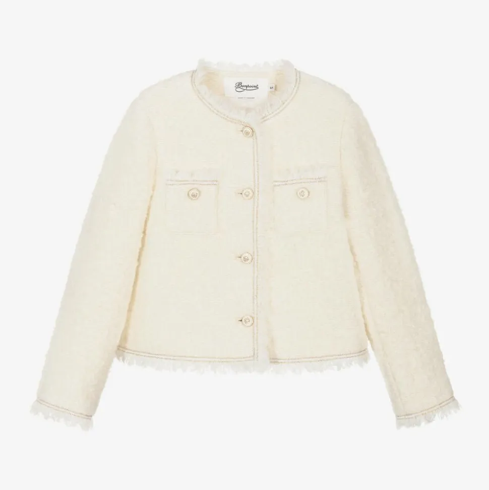 Ivory jacket for girls by luxury French brand Bonpoint, made in a soft blend of wool and viscose. Lovely for those smarter occasions, this elegant bouclé tweed jacket is styled with chest patch pockets, a rounded neckline and fringed edges. It has a sparkling gold trim that coordinates beautifully with the ivory and gold crest buttons and to ensure comfort, it is lined in soft cotton.