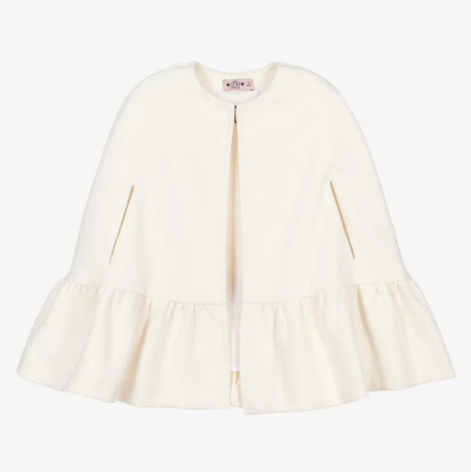 Chic ivory cape for girls by Phi Clothing, softly woven in a brushed viscose blend. Ideal for adding an elegant layer to her looks, it has discreet arm holes on the sides and a peplum-style hem. A black bow is appliquéd on the back for a pretty touch, and there is a discreet clasp fastening on the front.