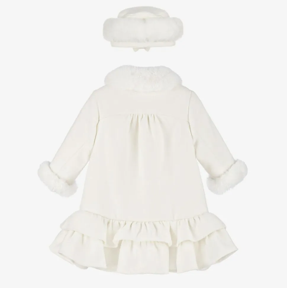 A smart ivory coat and hat set for younger girls by Sarah Louise, made in soft felted fabric with beautiful faux fur trims. Detailed with ruffles, gathers and sweet bows on the front, the coat is lined in satin and fastens with concealed buttons and a popper at the neck. It has hidden side seam pockets and comes with a matching hat to complete the traditional look.
