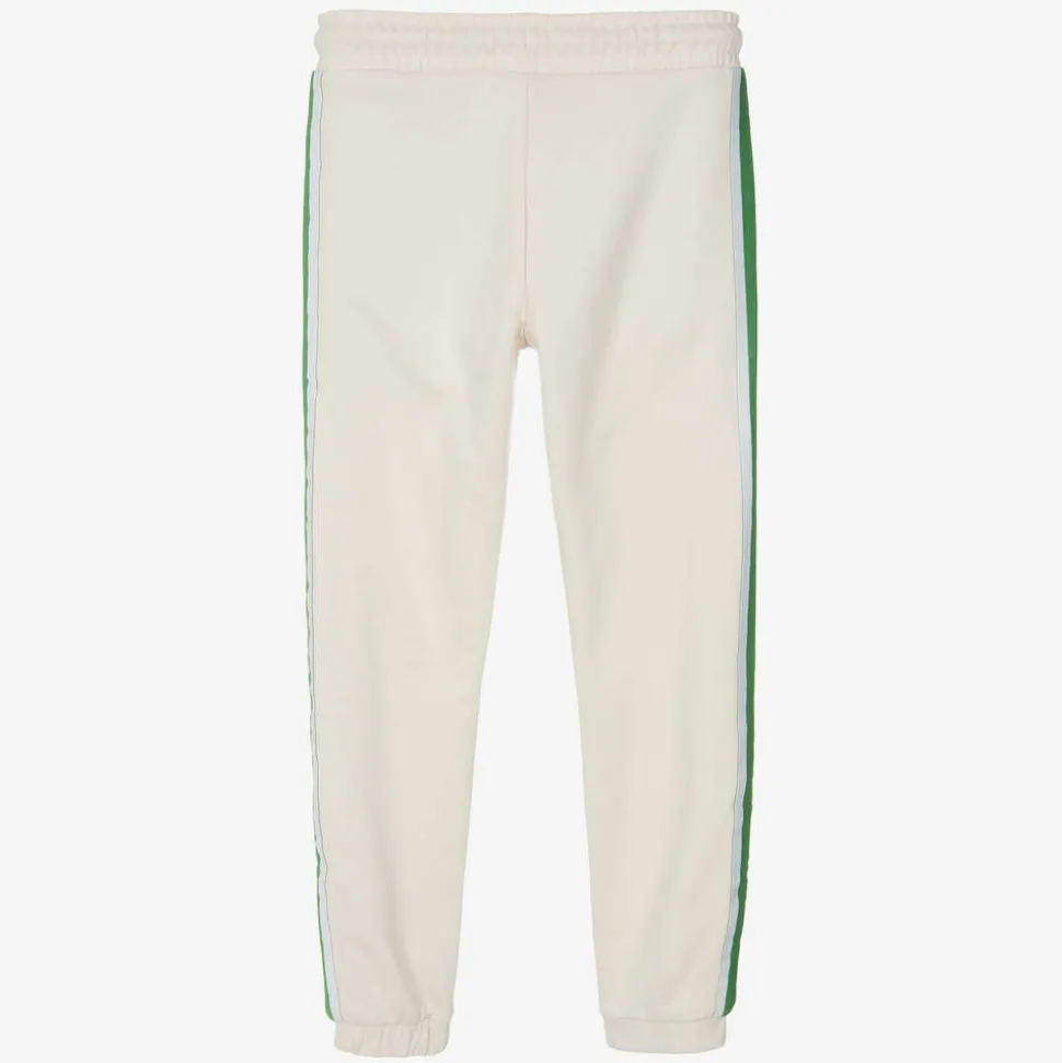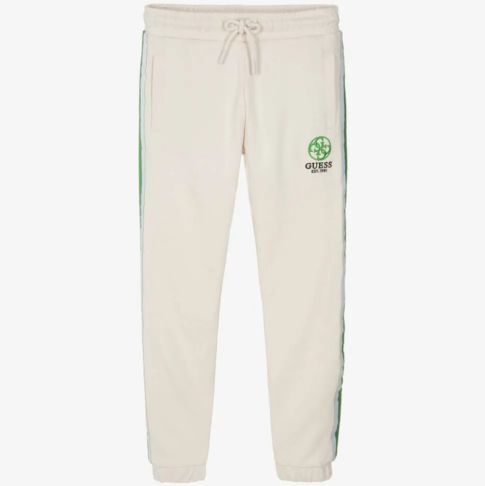 Ivory cotton joggers for girls by Guess, with smart green and white satin stripes down the legs. Made in soft, comfortable sweatshirt jersey, they have an elasticated, drawstring waist for a great fit and an embroidered 4g logo for brand identity.