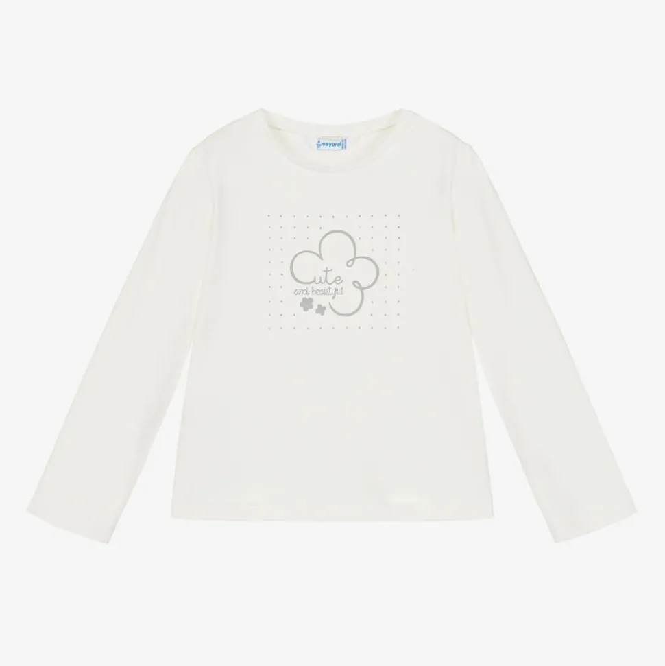 Ivory top for girls by Mayoral, made in soft and stretchy cotton jersey. This long-sleeved style has a slogan design on the front which reads 'Cute and beautiful' in the centre. This is surrounded by silver diamantés for extra sparkle.
