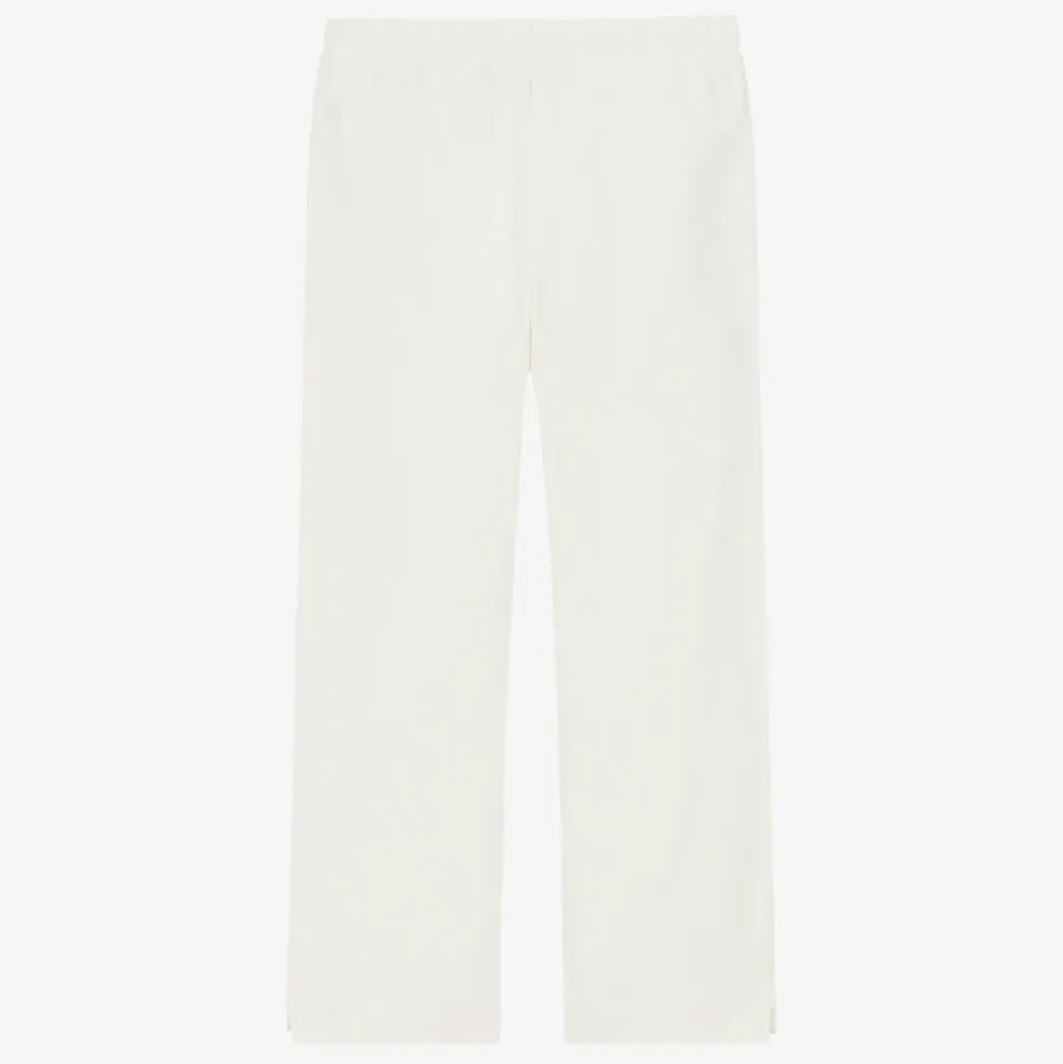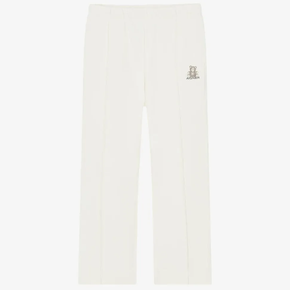 Casual ivory joggers for girls by AIGNER, made in soft cotton jersey. This pull-on style is styled with front seams on the straight legs and on-seam pockets. A cute, glittery teddy bear and logo motif are printed on one side.