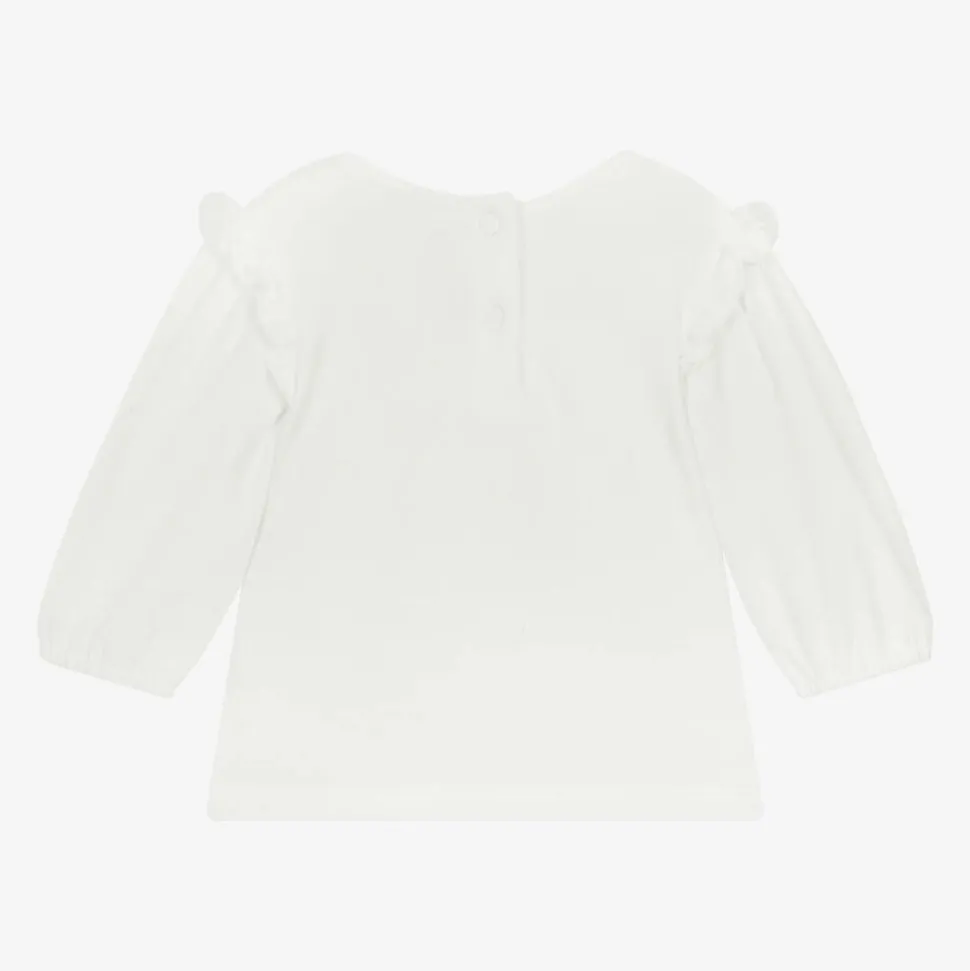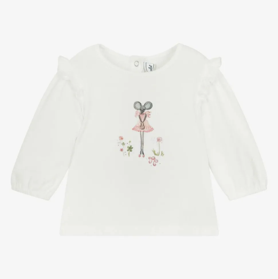 Ivory top for little girls by Tartine et Chocolat, made in soft, gentle, brushed cotton. Frill-trimmed, this sweet top has a friendly mouse amongst pink flowers on the front. The cuffs are elasticated and the back secures with easy-to-fasten poppers.