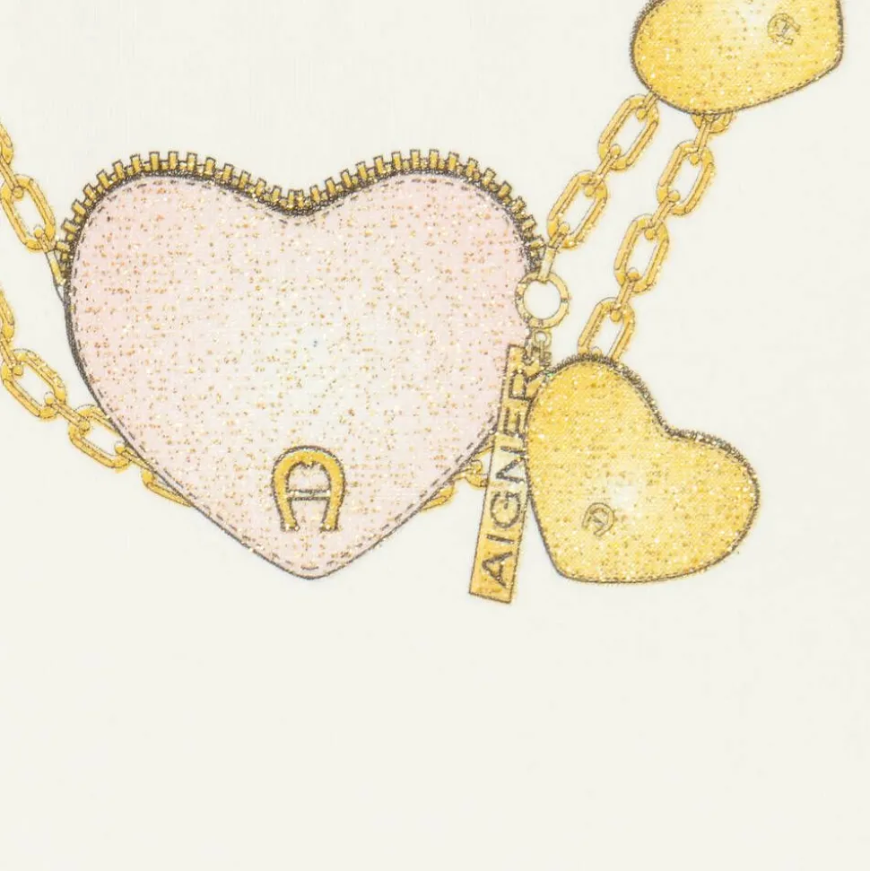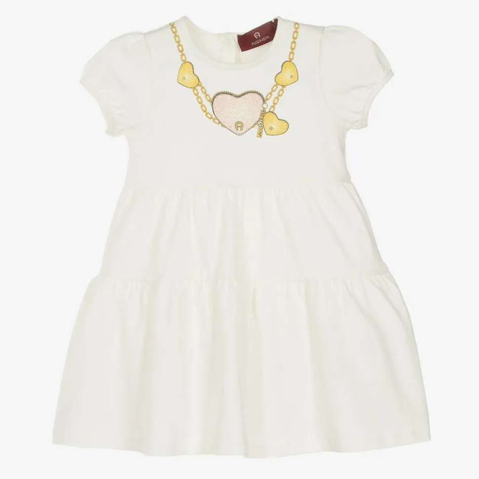 Ivory cotton dress for little girls by German brand AIGNER, made in soft, comfortable jersey. Adding a little sparkle to the day, it has a glittery pink and gold heart necklace with signature 'A' horseshoe logos printed on the front. The short sleeves are prettily puffed and the skirt has sweet, gathered tiers. There are popper fastenings on the back to help with dressing.